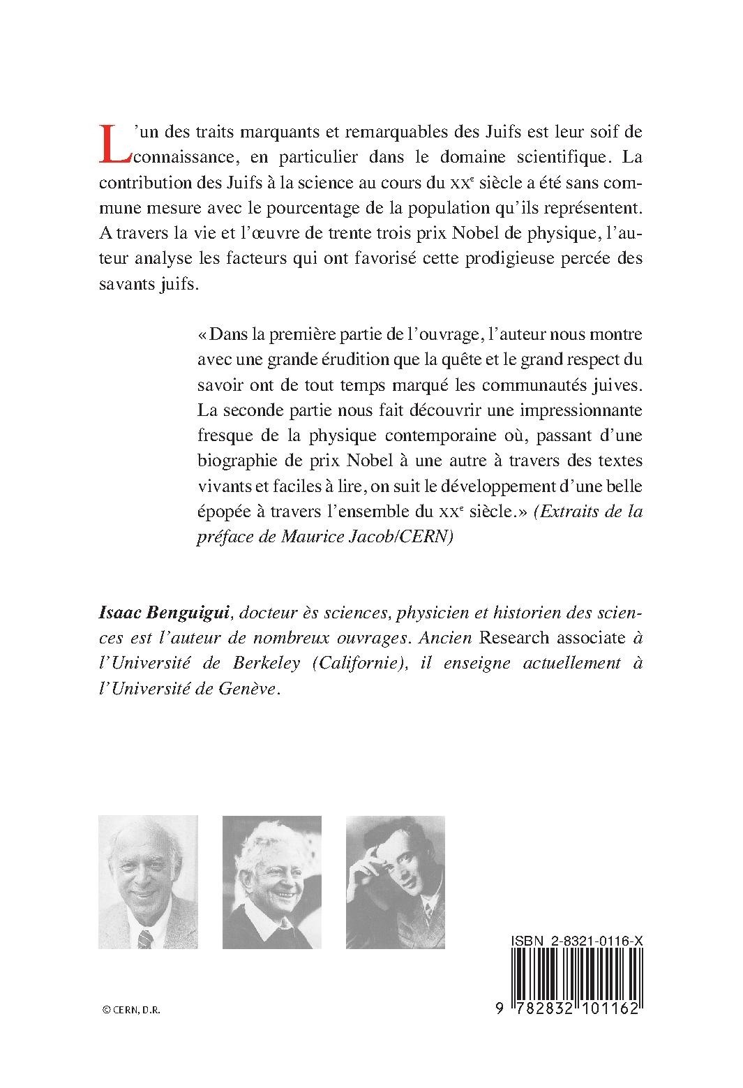 L'un des traits marquants et remarquables des Juifs est leur soif de connaissance, en particulier dans le domaine scientifique. La contribution des Juifs à la science au cours du XXe siècle a été sans commune mesure avec le pourcentage de la population qu'ils représentent. A travers la vie et l'œuvre de trente trois prix Nobel de physique, l'auteur analyse les facteurs qui ont favorisé cette prodigieuse percée des savants juifs.