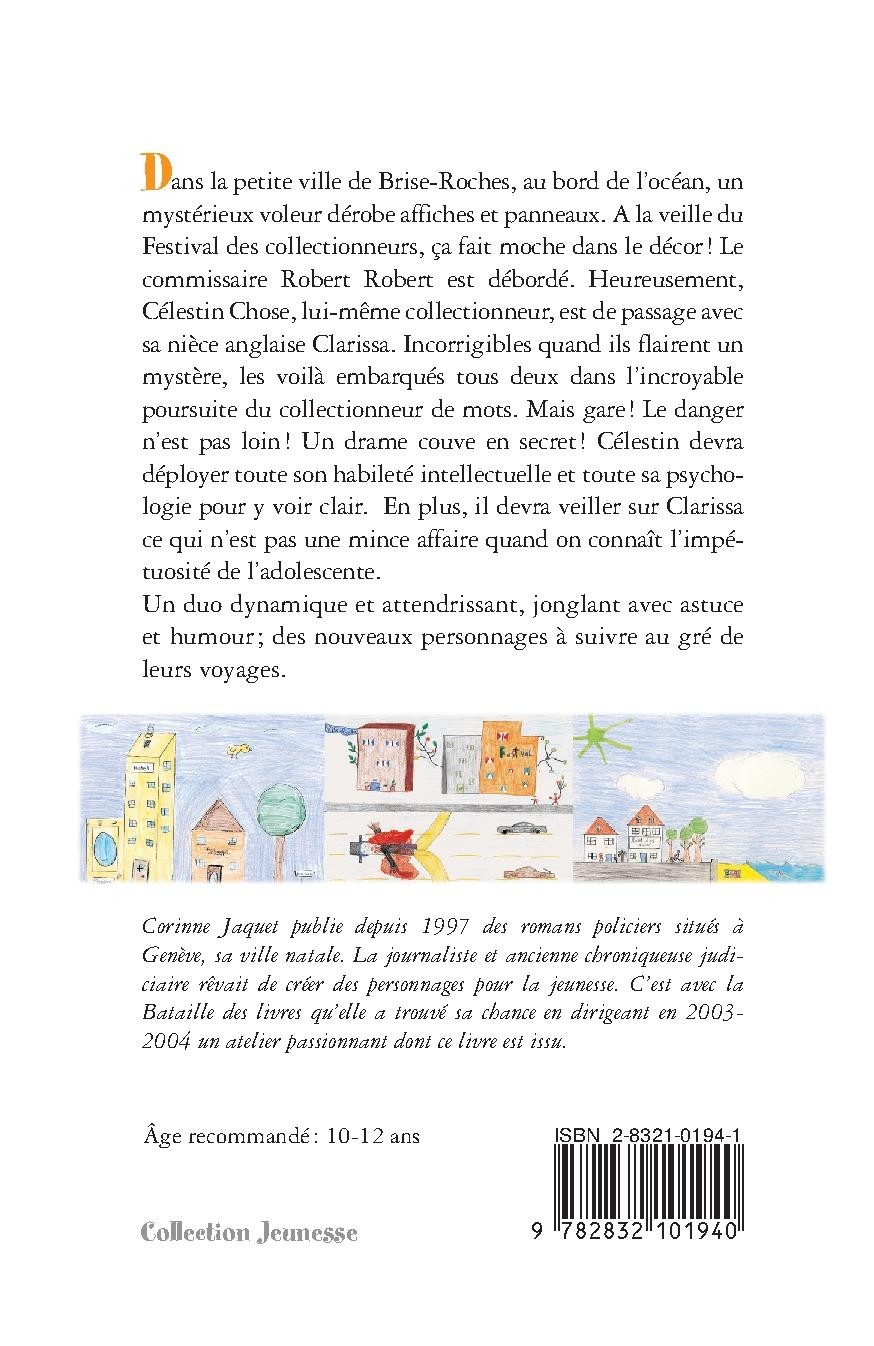 Dans la petite ville de Brise-Roches, au bord de l'océan, un mystérieux voleur dérobe affiches et panneaux. A la veille du Festival des collectionneurs, ça fait moche dans le décor ! Le commissaire Robert Robert est débordé. Heureusement, Célestin Chose, lui-même collectionneur, est de passage avec sa nièce anglaise Clarissa. Incorrigibles quand ils flairent un mystère, les voilà embarqués tous deux dans l'incroyable poursuite du collectionneur de mots. Mais gare ! Le danger n'est pas loin ! Un drame couve en secret ! Célestin devra déployer toute son habileté intellectuelle et toute sa psychologie pour y voir clair. En plus, il devra veiller sur Clarissa ce qui n'est pas une mince affaire quand on connaît l'impétuosité de l'adolescente. Un duo dynamique et attendrissant, jonglant avec astuce et humour ; des nouveaux personnages à suivre au gré de leurs voyages.