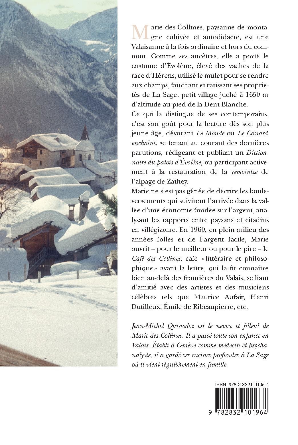 Marie des Collines, paysanne de montagne cultivée et autodidacte, est une Valaisanne à la fois ordinaire et hors du commun. Comme ses ancêtres, elle a porté le costume d`Évolène, élevé des vaches de la race d`Hérens, utilisé le mulet pour se rendre au champs, fauchant et ratissant ses propriétés de La Sage, petit village juché à 1650 mètres d`altitude au pied de la Dent Blanche. Ce qui la distingue de ses contemporains, c`est son goût pour la lecture dès son plus jeu âge, dévorant Le Monde ou Le Canard enchaîné, se tenant au courant des dernières parutions, rédigeant et publiant un Dictionnaire du patois d`Évolène, ou participant activement à la restauration de la remointze de l`alpage de Zathey. Marie ne s`est pas gênée de décrire les bouleversements qui suivirent l`arrivée dans la vallée d`une économie fondée sur l`argent, analysant les rapports entre paysans et citadins en villégiature. En 1960, en plein milieu des années folles et de l`argent facile, Marie ouvrit - pour le meilleur ou pour le pire - le Café des Collines, café " littéraire et philosophique " avant la lettre, qui la fit connaître bien au-delà des frontières du Valais, se liant d`amitié avec des artistes et des musiciens célèbres tels que Maurice Aufair, Henri Dutilleux, Émile de Ribeaupierre, etc.