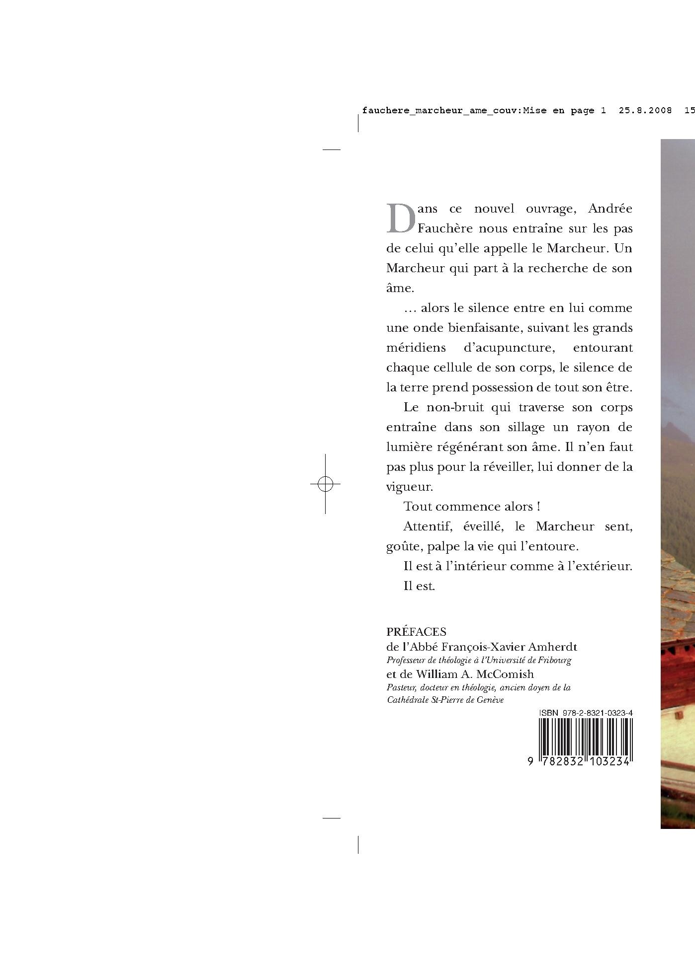 Dans ce nouvel ouvrage, Andrée Fauchère nous entraîne sur les pas de celui qu'elle appelle le Marcheur. Un Marcheur qui part à la recherche de son âme. ...alors le silence entre en lui comme une onde bienfaisante, suivant les grands méridiens d'acupuncture, entourant chaque cellule de son corps, le silence de la terre prend possession de tout son être. Le non bruit qui traverse son corps entraîne dans son sillage un rayon de lumière régénérant son âme. Il n'en faut pas plus pour la réveiller, lui donner de la vigueur. Tout commence alors! Attentif, éveillé, le Marcheur sent, goûte, palpe la vie qui l'entoure. Il est à l'intérieur comme à l'extérieur. Il est. Préfaces : de l'Abbé François-Xavier Amherdt, Professeur de théologie à l'Université de Fribourg et de William A. Mc Comish, Pasteur, docteur en théologie, ancien doyen de la Cathédrale St-Pierre de Genève.