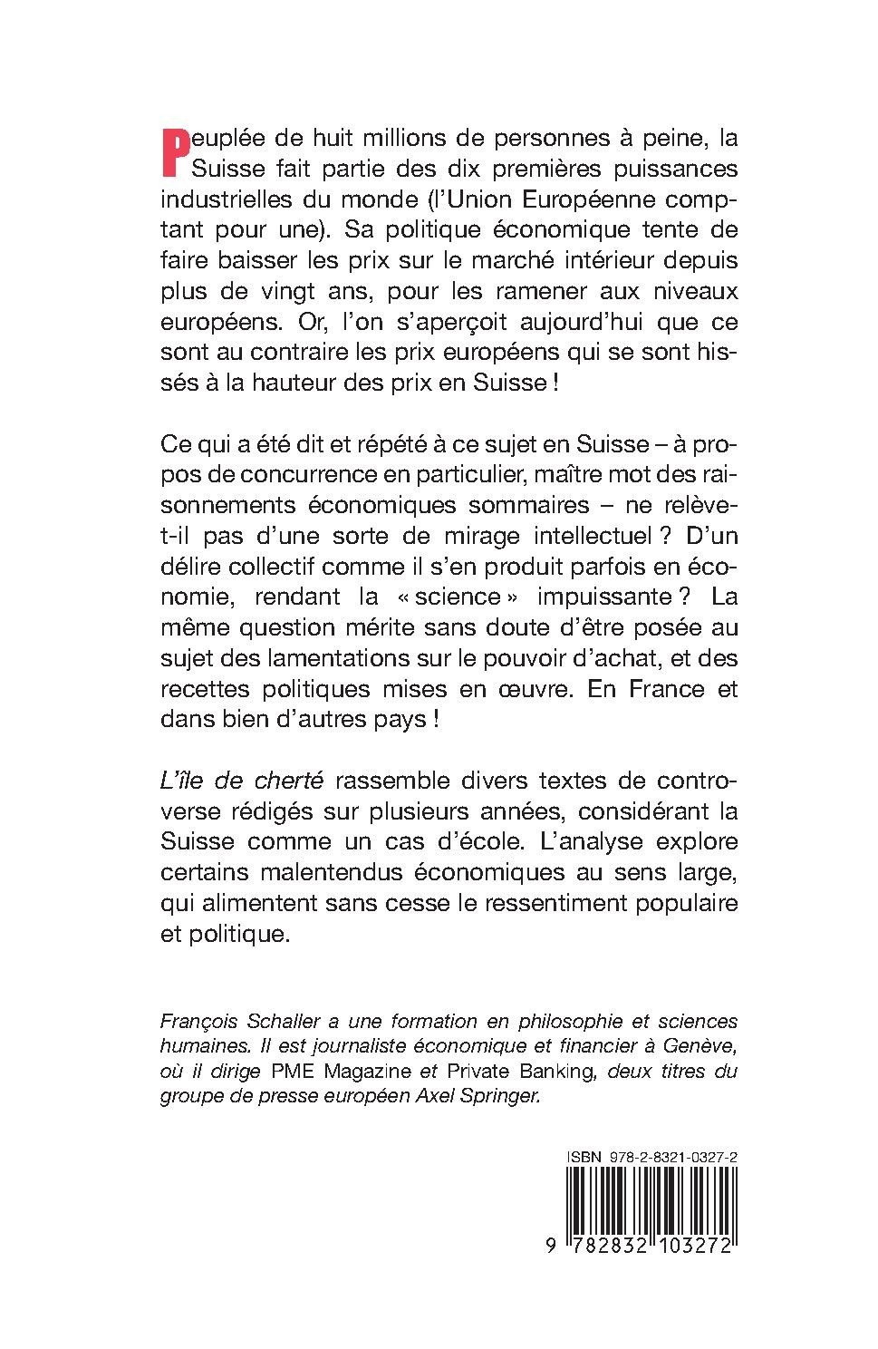 Peuplée de huit millions de personnes à peine, la Suisse fait partie des dix premières puissances industrielles du monde (l'Union Européenne comptant pour une). Sa politique économique tente de faire baisser les prix sur le marché intérieur depuis plus de vingt ans, pour les ramener aux niveaux européens. Or, l'on s'aperçoit aujourd'hui que ce sont au contraire les prix européens qui se sont hissés à la hauteur des prix en Suisse ! Ce qui a été dit et répété à ce sujet en Suisse - à propos de concurrence en particulier, maître-mot des raisonnements économiques sommaires - ne relève-t- il pas d'une sorte de mirage intellectuel ? D'un délire collectif comme il s'en produit parfois en économie, rendant la " science " impuissante ? La même question mérite sans doute d'être posée au sujet des lamentations sur le pouvoir d'achat, et des recettes politiques mises en œuvre. En France et dans bien d'autres pays ! L'île de cherté rassemble divers textes de controverse rédigés sur plusieurs années, considérant la Suisse comme un cas d'école. L'analyse explore certains malentendus économiques au sens large, qui alimentent sans cesse le ressentiment populaire et politique. François Schaller a une formation en philosophie et sciences humaines. Il est journaliste économique et financier à Genève, où il dirige " PME Magazine " et " Private Banking ", deux titres du groupe de presse européen Axel Springer.