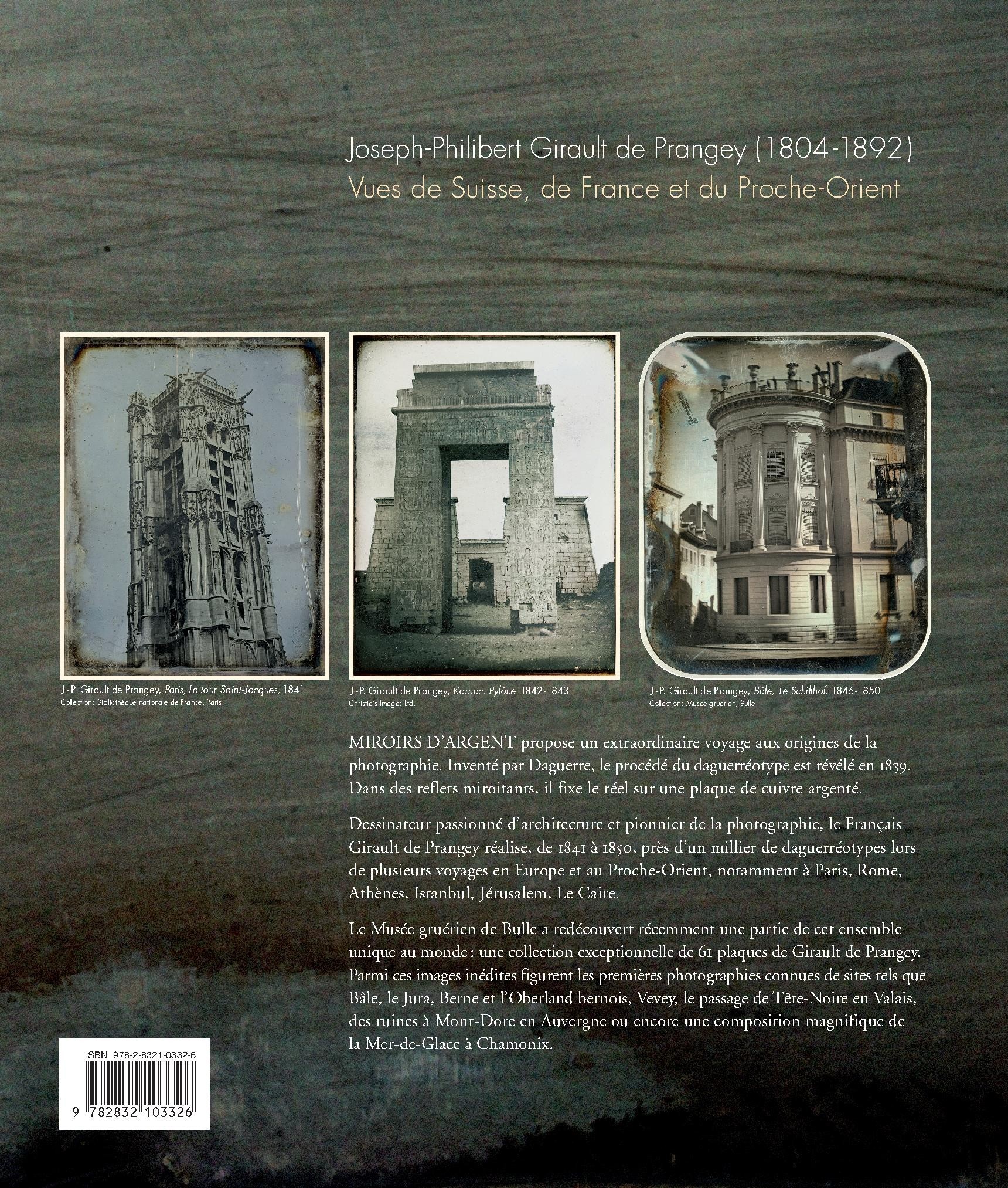 MIROIRS D'ARGENT propose un extraordinaire voyage aux origines de la photographie. Inventé par Daguerre, le procédé du daguerréotype est révélé en 1839. Dans des reflets miroitants, il fixe le réel sur une plaque de cuivre argenté. Dessinateur passionné d'architecture et pionnier de la photographie, le Français Girault de Prangey réalise, de 1841 à 1850, près d'un millier de daguerréotypes lors de plusieurs voyages en Europe et au Proche-Orient, notamment à Paris, Rome, Athènes, Istanbul, Jérusalem, Le Caire.Le Musée gruérien de Bulle a redécouvert récemment une partie de cet ensemble unique au monde : une collection exceptionnelle de 61 plaques de Girault de Prangey. Parmi ces images inédites figurent les premières photographies connues de sites tels que Bâle, le Jura, Berne et l'Oberland bernois, Vevey, le passage de Tête-Noire en Valais, des ruines à Mont Dore en Auvergne ou encore une composition magnifique de la Mer de Glace à Chamonix.