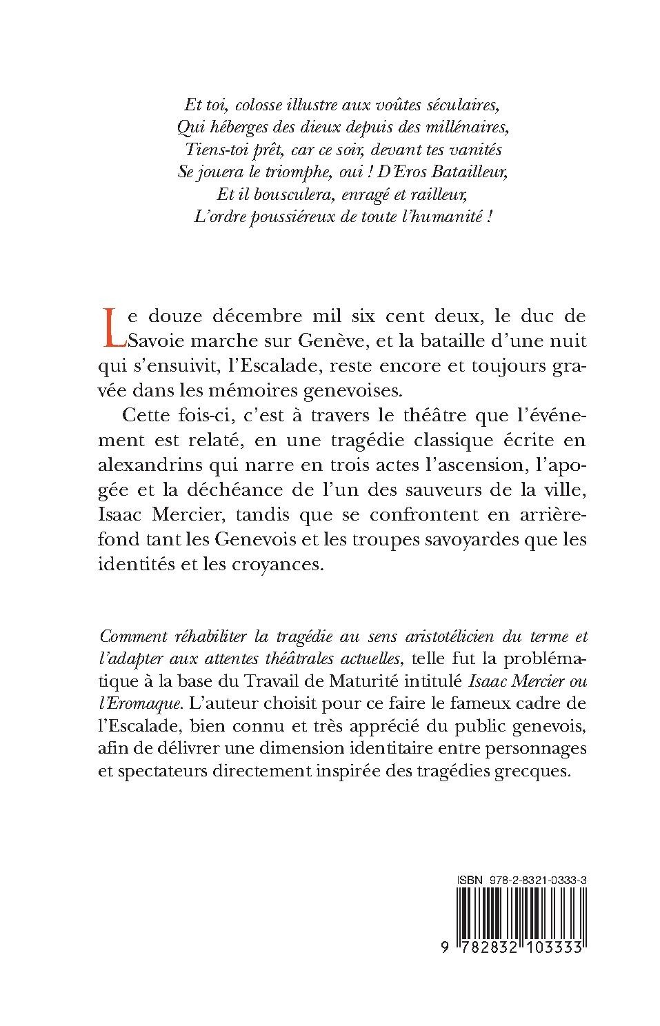 Le douze décembre mil six-cents deux, le duc de Savoie marche sur Genève, et la bataille d'une nuit qui s'ensuivit, l'Escalade, reste encore et toujours gravée dans les mémoires genevoises. Cette fois-ci, c'est à travers le théâtre que l'événement est relaté, en une tragédie classique écrite en alexandrins qui narre en trois actes l'ascension, l'apogée et la déchéance de l'un des sauveur de la ville, Isaac Mercier, tandis que se confrontent en arrière-fond tant les Genevois et les troupes savoyardes que les identités et les croyances. Comment réhabiliter la tragédie au sens aristotélicien du terme et l'adapter aux attentes théâtrales actuelles, telle fut la problématique à la base du Travail de Maturité intitulé Isaac Mercier ou l'Eromaque. L'auteur choisit pour ce faire le fameux cadre de l'Escalade, bien connu et très apprécié du public genevois, afin de délivrer une dimension identitaire entre personnages et spectateurs directement inspirée des tragédies grecques.