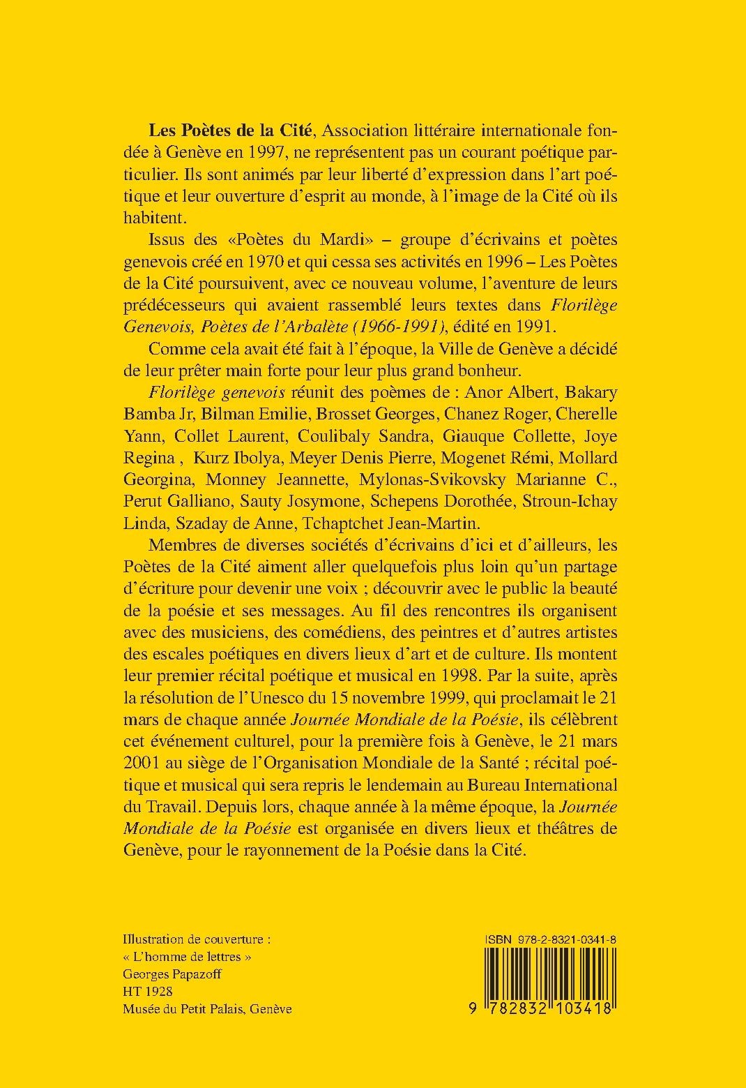 Issus des "Poètes du Mardi" - groupe d'écrivains et poètes genevois créé en 1970 et qui cessa ses activités en 1996 - Les Poètes de la Cité poursuivent, avec ce nouveau volume, l'aventure de leurs prédécesseurs qui avaient rassemblé leurs textes dans Florilège Genevois Les Poètes, édité en 1991. Comme cela avait été fait à l'époque, la Ville de Genève a décidé de leur prêter main forte pour leur plus grand bonheur. Florilège genevois réunit des poèmes de : Anor Albert, Bakary Bamba Jr, Bilman Emilie, Brosset Georges, Chanez Roger, Cherelle Yann, Collet Laurent, Coulibaly Sandra, Giauque Collette, Joye Regina , Kurz Ibolya, Meyer Denis Pierre, Mogenet Rémi, Molard Georgina, Monney Jeannette, Mylonas-Svikovsky Marianne C., Perut Galliano, Sauty Josymone, Schepens Dorothée, Stroun-Ichay Linda, Szaday de Anne, Tchaptchet Jean-Martin. Membres de diverses sociétés d'écrivains d'ici et d'ailleurs, les Poètes de la Cité aiment aller quelquefois plus loin qu'un partage d'écriture pour devenir une voix ; découvrir avec le public la beauté de la poésie et ses messages. Au fil des rencontres ils organisent avec des musiciens, des comédiens, des peintres et d'autres artistes des escales poétiques en divers lieux d'art et de culture. Ils montent leur premier récital poétique et musical en 1998. Par la suite, après la résolution de l'Unesco du 15 novembre 1999, qui proclamait le 21 mars de chaque année Journée Mondiale de la Poésie, ils célèbrent cet événement culturel, pour la première fois à Genève, le 21 mars 2001 au siège de l'Organisation Mondiale de la Santé ; récital poétique et musical qui sera repris le lendemain au Bureau International du Travail. Depuis lors, chaque année à la même époque, la Journée Mondiale de la Poésie est organisée en divers lieux et théâtres de Genève, pour le rayonnement de la Poésie dans la Cité.