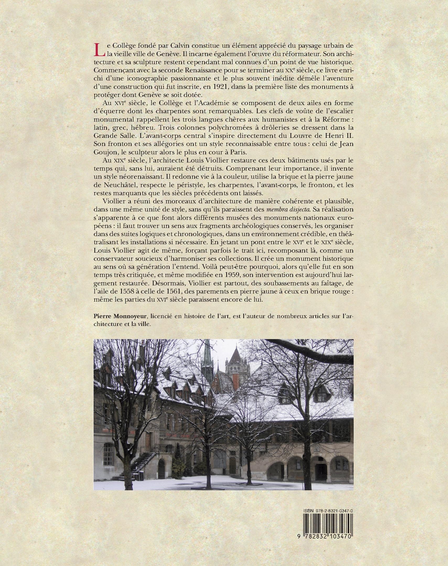 Le Collège fondé par Calvin constitue un élément apprécié du paysage urbain de la vieille ville de Genève. Il incarne également l'œuvre du réformateur. Son architecture et sa sculpture restent cependant mal connus d'un point de vue historique. Commençant avec la seconde Renaissance pour se terminer au XXe siècle, ce livre enrichi d'une iconographie passionnante et le plus souvent inédite démêle l'aventure d'une construction qui fut inscrite, en 1921, dans la première liste des monuments à protéger dont Genève se soit dotée. Au XVIe siècle, le Collège et l'Académie se composent de deux ailes en forme d'équerre dont les charpentes sont remarquables. Les clefs de voûte de l'escalier monumental rappellent les trois langues chères aux humanistes et à la Réforme : latin, grec, hébreu. Trois colonnes polychromées à drôleries se dressent dans la Grande Salle. L'avant-corps central s'inspire directement du Louvre de Henri II. Son fronton et ses allégories ont un style reconnaissable entre tous : celui de Jean Goujon, le sculpteur alors le plus en cour à Paris. Au XIXe siècle, l'architecte Louis Viollier restaure ces deux bâtiments usés par le temps qui, sans lui, auraient été détruits. Comprenant leur importance, il invente un style néo-renaissant. Il redonne vie à la couleur, utilise la brique et la pierre jaune de Neuchâtel, respecte le péristyle, les charpentes, l'avant-corps, le fronton, et les restes marquants que les siècles précédents ont laissés. Viollier a réuni des morceaux d'architecture de manière cohérente et plausible, dans une même unité de style, sans qu'ils paraissent des membra disjecta. Sa réalisation s'apparente à ce que font alors différents musées des monuments nationaux européens : il faut trouver un sens aux fragments archéologiques conservés, les organiser dans des suites logiques et chronologiques, dans un environnement crédible, en théâtralisant les installations si nécessaires (…) Pierre Monnoyeur, historien de l'art, est l'auteur de nombreux articles sur l'architecture et la ville.