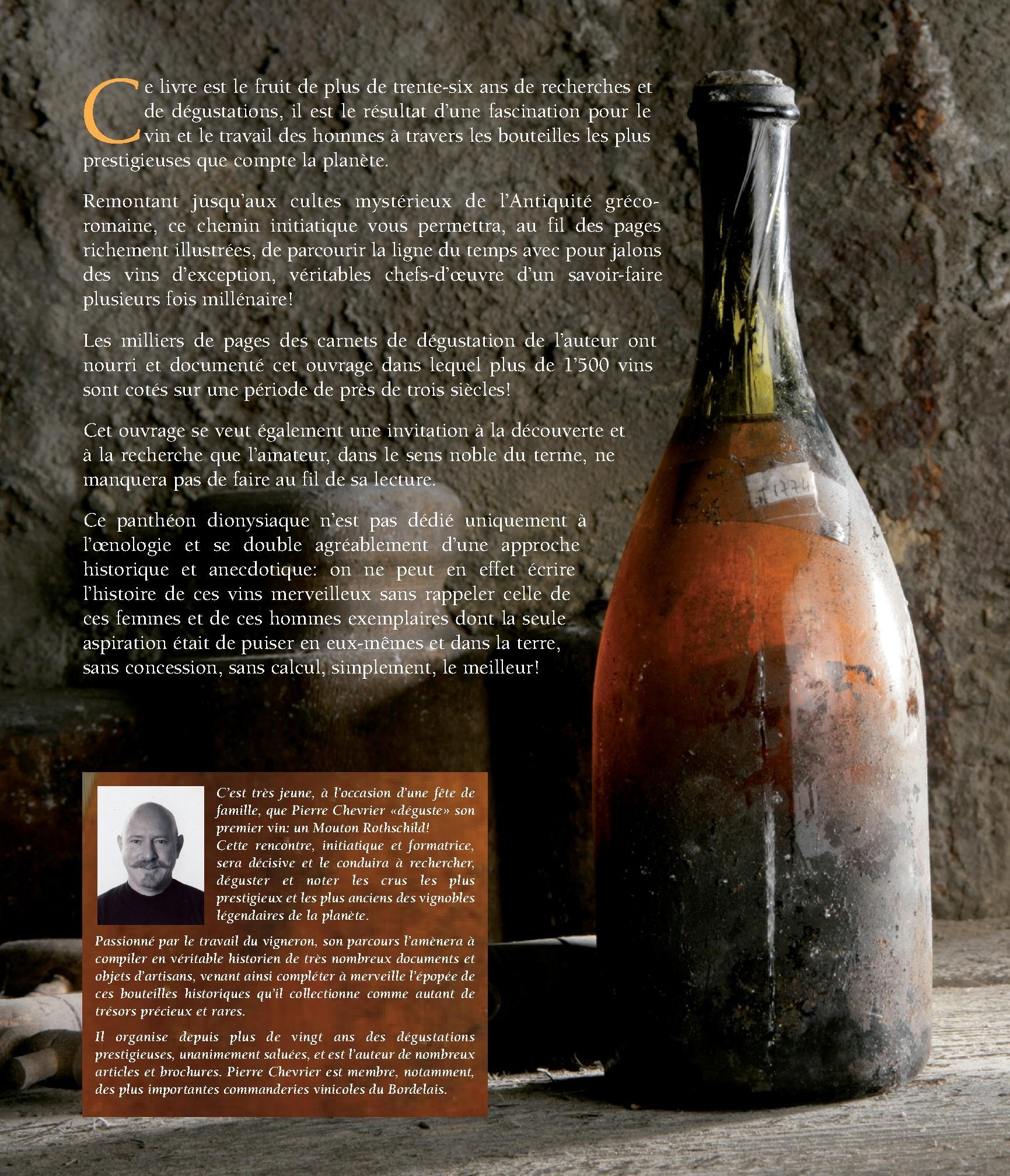Ce livre est le fruit de plus de 36 ans de recherches et de dégustations, il est le résultat d'une fascination pour le vin et le travail des hommes à travers les bouteilles les plus prestigieuses que compte la planète. Remontant jusqu'aux cultes mystérieux de l'Antiquité gréco-romaine, ce chemin initiatique vous permettra, au fil des pages richement illustrées, de parcourir la ligne du temps avec pour jalons des vins d'exception, véritables chefs-d'œuvre d'un savoir-faire plusieurs fois millénaire! Les milliers de pages des carnets de dégustation de l'auteur ont nourri et documenté cet ouvrage dans lequel plus de 1'500 vins sont cotés sur une période de près de trois siècles! Cet ouvrage se veut également une invitation à la découverte et à la recherche que l'amateur, dans le sens noble du terme, ne manquera pas de faire au fil de sa lecture. Ce panthéon dionysiaque n'est pas dédié uniquement à l'œnologie et se double agréablement d'une approche historique et anecdotique: on ne peut en effet écrire l'histoire de ces vins merveilleux sans rappeler celle de ces femmes et de ces hommes exemplaires dont la seule aspiration était de puiser en eux-mêmes et dans la terre, sans concessions, sans calcul, simplement, le meilleur!
