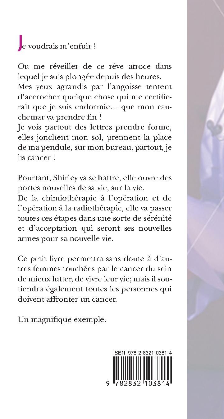 Je voudrais m'enfuir ! Ou me réveiller de ce rêve atroce dans lequel je suis plongée depuis des heures. Mes yeux agrandis par l'angoisse tentent d'accrocher quelque chose qui me certifierait que je suis endormie... que mon cauchemar va prendre fin ! Je vois partout des lettres prendre forme, elles jonchent mon sol, prennent la place de ma pendule, sur mon bureau, partout, je lis cancer ! Pourtant, Shirley va se battre, elle ouvre des portes nouvelles de sa vie, sur la vie. De la chimiothérapie à l'opération et de l'opération à la radiothérapie, elle va passer toutes ces étapes dans une sorte de sérénité et d'acceptation qui seront ses nouvelles armes pour sa nouvelle vie. Ce petit livre permettra sans doute à d'autres femmes touchées par le cancer du sein de mieux lutter, de vivre leur vie; mais il soutiendra également toutes les personnes qui doivent affronter un cancer. Un magnifique exemple.
