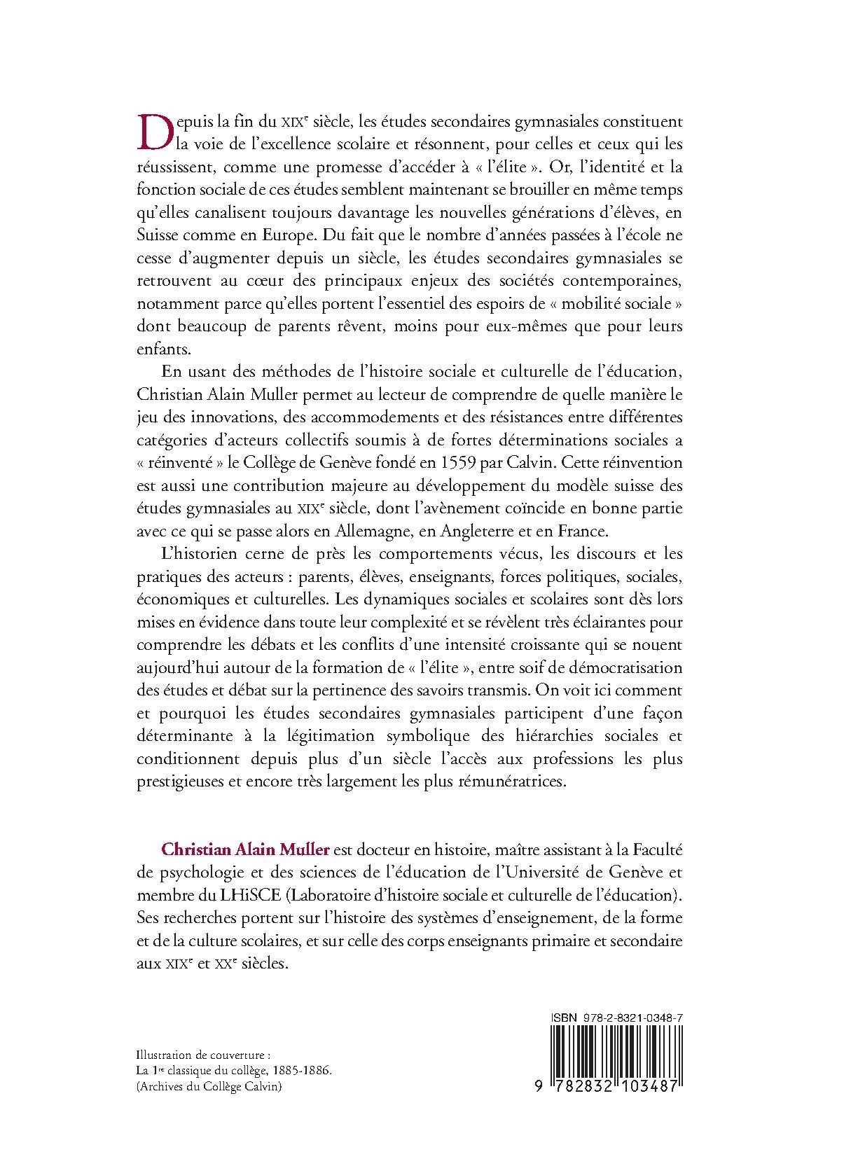 Depuis la fin du XIXe siècle, les études secondaires gymnasiales constituent la voie de l'excellence scolaire et résonnent, pour celles et ceux qui les réussissent, comme une promesse d'accéder à "l'élite". Or, l'identité et la fonction sociale de ces études semblent maintenant se brouiller en même temps qu'elles canalisent toujours davantage les nouvelles générations d'élèves, en Suisse comme en Europe. Du fait que le nombre d'années passées à l'école ne cesse d'augmenter depuis un siècle, les études secondaires gymnasiales se retrouvent au cœur des principaux enjeux des sociétés contemporaines, notamment parce qu'elles portent l'essentiel des espoirs de " mobilité sociale " dont beaucoup de parents rêvent, moins pour eux-mêmes que pour leurs enfants. ue pour leurs enfants. Voici un ouvEn usant des méthodes de l'histoire sociale et culturelle de l'éducation, Christian Alain Muller permet au lecteur de comprendre de quelle manière le jeu des innovations, des accommodements et des résistances entre différentes catégories d'acteurs collectifs soumis à de fortes déterminations sociales a "réinventé" le Collège de Genève fondé en 1559 par Calvin. Cette réinvention est aussi une contribution majeure au développement du modèle suisse des études gymnasiales au XIXe siècle, dont l'avènement coïncide en bonne partie avec ce qui se passe alors en Allemagne, en Angleterre et en France. L'historien cerne de près les comportements vécus, les discours et les pratiques des acteurs : parents, élèves, enseignants, forces politiques, sociales, économiques et culturelles. Les dynamiques sociales et scolaires sont dès lors mises en évidence dans toute leur complexité et se révèlent très éclairantes pour comprendre les débats et les conflits d'une intensité croissante qui se nouent aujourd'hui autour de la formation de "l'élite", entre soif de démocratisation des études et débat sur la pertinence des savoirs transmis. On voit ici comment et pourquoi les études secondaires gymnasiales participent d'une façon