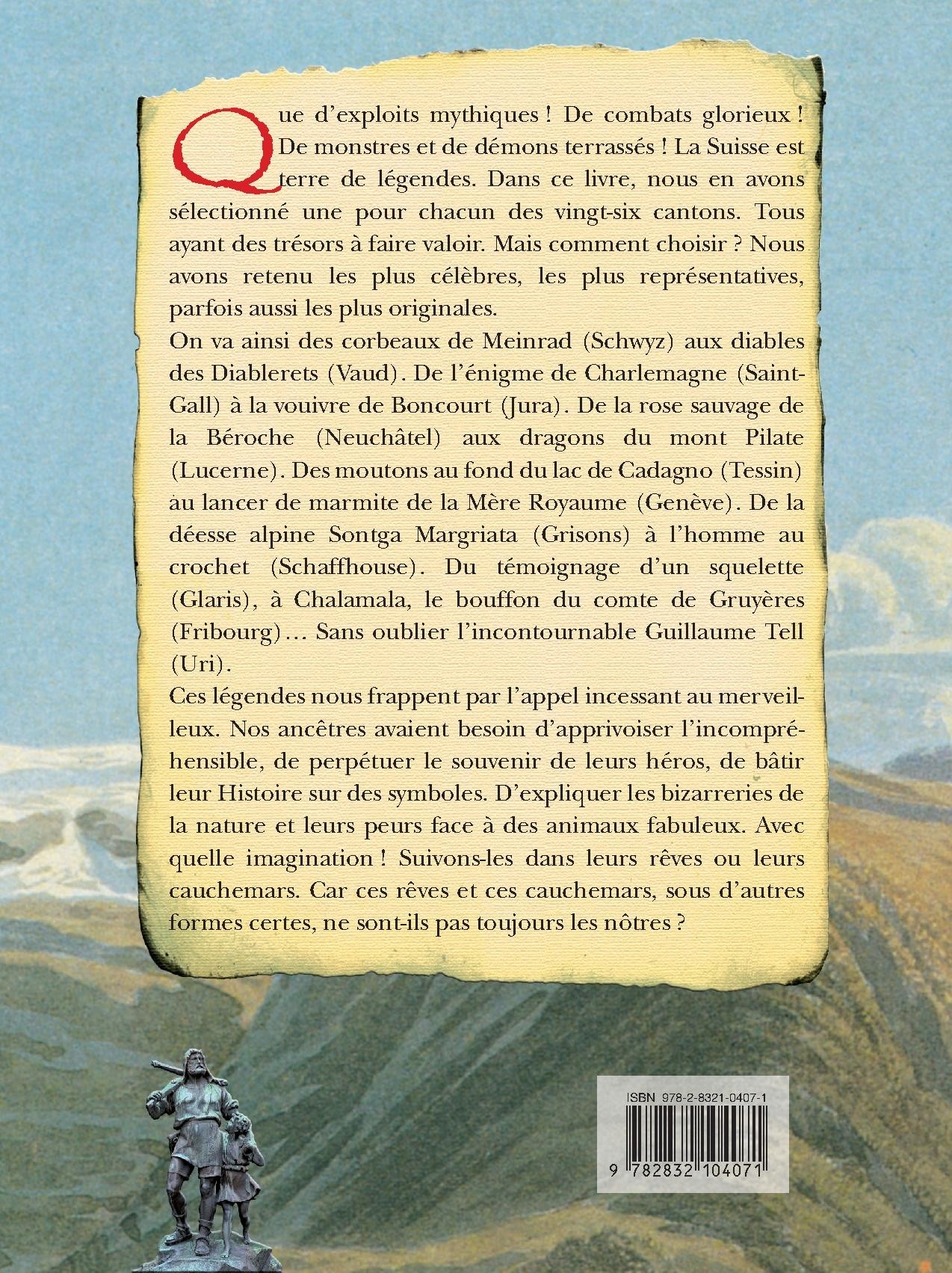 Que d`exploits mythiques ! De combats glorieux ! De monstres et de démons terrassés ! La Suisse est terre de légendes. Dans ce livre, nous en avons sélectionné une pour chacun des vingt-six cantons. Tous ayant des trésors à faire valoir. Mais comment choisir ? Nous avons retenu les plus célèbres, les plus représentatives, parfois aussi les plus originales. On va ainsi des corbeaux de Meinrad (Schwyz) aux diables des Diablerets (Vaud). De l`énigme de Charlemagne (Saint- Gall) à la vouivre de Boncourt (Jura). De la rose sauvage de la Béroche (Neuchâtel) aux dragons du mont Pilate (Lucerne). Des moutons au fond du lac de Cadagno (Tessin) au lancer de marmite de la Mère Royaume (Genève). De la déesse alpine sontga Margriata (Grisons) à l`homme au crochet (Schaffhouse). Du témoignage d`un squelette (Glaris), à Chalamala, le bouffon du comte de Gruyères (Fribourg)… Sans oublier l`incontournable Guillaume Tell (Uri). Ces légendes nous frappent par l`appel incessant au merveilleux. Nos ancêtres avaient besoin d`apprivoiser l`incompréhensible, de perpétuer le souvenir de leurs héros, de bâtir leur Histoire sur des symboles. D`expliquer les bizarreries de la nature et leurs peurs face à des animaux fabuleux. Avec quelle imagination ! Suivons-les dans leurs rêves ou leurs cauchemars. Car ces rêves et ces cauchemars, sous d`autres formes certes, ne sont-ils pas toujours les nôtres ?