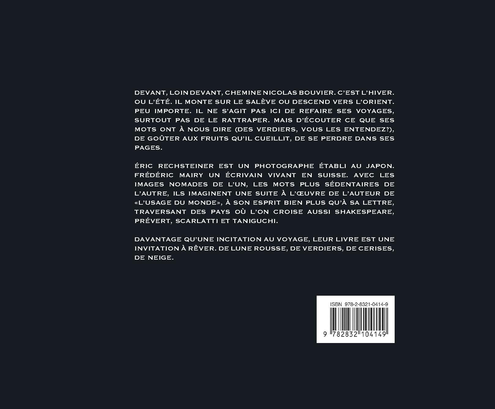 Devant, loin devant, chemine Nicolas Bouvier. C`est l`hiver. Ou l`été. Il monte sur le Salève ou descend vers l`Orient. Peu importe. Il ne s`agit pas ici de refaire ses voyages, surtout pas de le rattraper. Mais d`écouter ce que ses mots ont à nous dire (des verdiers, vous les entendez?), de goûter aux fruits qu`il cueillit, de se perdre dans ses pages. Eric Rechsteiner est un photographe établi au Japon. Frédéric Mairy un écrivain vivant en Suisse. Avec les images nomades de l`un, les mots plus sédentaires de l`autre, ils imaginent une suite à l`œuvre de l`auteur de L`usage du monde, à son esprit bien plus qu`à sa lettre, traversant des pays où l`on croise aussi Shakespeare, Prévert, Scarlatti et Taniguchi. Davantage qu`une incitation au voyage, leur livre est une invitation à rêver. De lune rousse, de verdiers, de cerises, de neige.