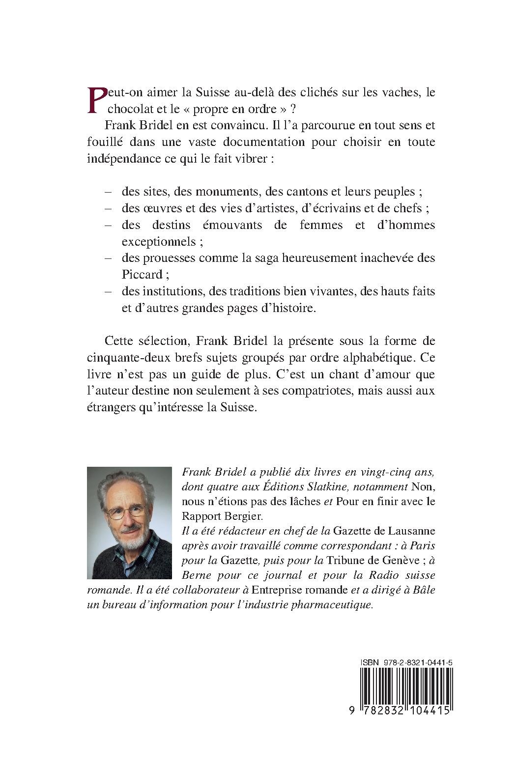 Peut-on aimer la Suisse au-delà des clichés sur les vaches, le chocolat et le " propre en ordre " ? Frank Bridel en est convaincu. Il l`a parcourue en tout sens et fouillé dans une vaste documentation pour choisir en toute indépendance ce qui le fait vibrer : - des sites, des monuments, des cantons et leurs peuples ; - des oeuvres et des vies d`artistes, d`écrivains et de chefs ; - des destins émouvants de femmes et d`hommes exceptionnels ; - des prouesses comme la saga heureusement inachevée des Piccard ; - des institutions, des traditions bien vivantes, des hauts faits et d`autres grandes pages d`histoire. Cette sélection, Frank Bridel la présente sous la forme de cinquante-deux brefs sujets groupés par ordre alphabétique. Ce livre n`est pas un guide de plus. C`est un chant d`amour que l`auteur destine non seulement à ses compatriotes, mais aussi aux étrangers qu`intéresse la Suisse. Frank Bridel a publié dix livres en vingt-cinq ans, dont quatre aux Éditions Slatkine, notamment Non, nous n`étions pas des lâches et Pour en finir avec le Rapport Bergier. Il a été rédacteur en chef de la Gazette de Lausanne après avoir travaillé comme correspondant : à Paris pour la Gazette, puis pour la Tribune de Genève ; à Berne pour ce journal et pour la Radio suisse romande. Il a été collaborateur à Entreprise romande et a dirigé à Bâle un bureau d`information pour l`industrie pharmaceutique.