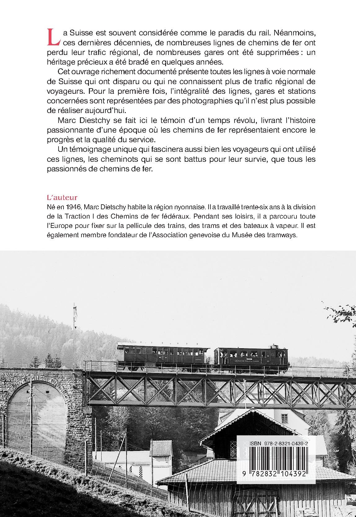 La Suisse est souvent considérée comme le paradis du rail. Néanmoins, ces dernières décennies, de nombreuses lignes de chemins de fer ont perdu leur trafic régional, de nombreuses gares ont été supprimées : un héritage précieux a été bradé en quelques années. Cet ouvrage richement documenté présente toutes les lignes à voie normale de Suisse qui ont disparu ou qui ne connaissent plus de trafic régional de voyageurs. Pour la première fois, l`intégralité des lignes, gares et stations concernées sont représentées par des photographies qu`il n`est plus possible de réaliser aujourd`hui. Marc Diestchy se fait ici le témoin d`un temps révolu, livrant l`histoire passionnante d`une époque où les chemins de fer représentaient encore le progrès et la qualité du service. Un témoignage unique qui fascinera aussi bien les voyageurs qui ont utilisé ces lignes, les cheminots qui se sont battus pour leur survie, que tous les passionnés de chemins de fer. Né en 1946, Marc Dietschy habite la région nyonnaise. Il a travaillé trente-six ans à la division de la Traction I des Chemins de fer fédéraux. Pendant ses loisirs, il a parcouru toute l`Europe pour fixer sur la pellicule des trains, des trams et des bateaux à vapeur. Il est également membre fondateur de l`Association genevoise du Musée des tramways.
