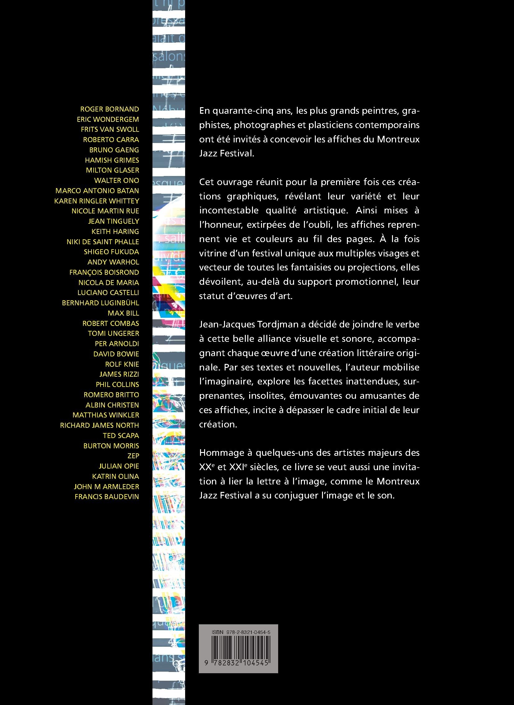 En quarante-cinq ans, les plus grands peintres, graphistes, photographes et plasticiens contemporains ont été invités à concevoir les affiches du Montreux Jazz Festival. Cet ouvrage réunit pour la première fois ces créations graphiques, révélant leur variété et leur incontestable qualité artistique. Ainsi mises à l`honneur, extirpées de l`oubli, les affiches reprennent vie et couleurs au fil des pages. À la fois vitrine d`un festival unique aux multiples visages et vecteur de toutes les fantaisies ou projections, elles dévoilent, au-delà du support promotionnel, leur statut d`œuvres d`art. Jean-Jacques Tordjman a décidé de joindre le verbe à cette belle alliance visuelle et sonore, accompagnant chaque œuvre d`une création littéraire originale. Par ses textes et nouvelles, l`auteur mobilise l`imaginaire, explore les facettes inattendues, surprenantes, insolites, émouvantes ou amusantes de ces affiches, incite à dépasser le cadre initial de leur création. Hommage à quelques-uns des artistes majeurs des XXe et XXIe siècles, ce livre se veut aussi une invitation à lier la lettre à l`image, comme le Montreux Jazz Festival a su conjuguer l`image et le son.