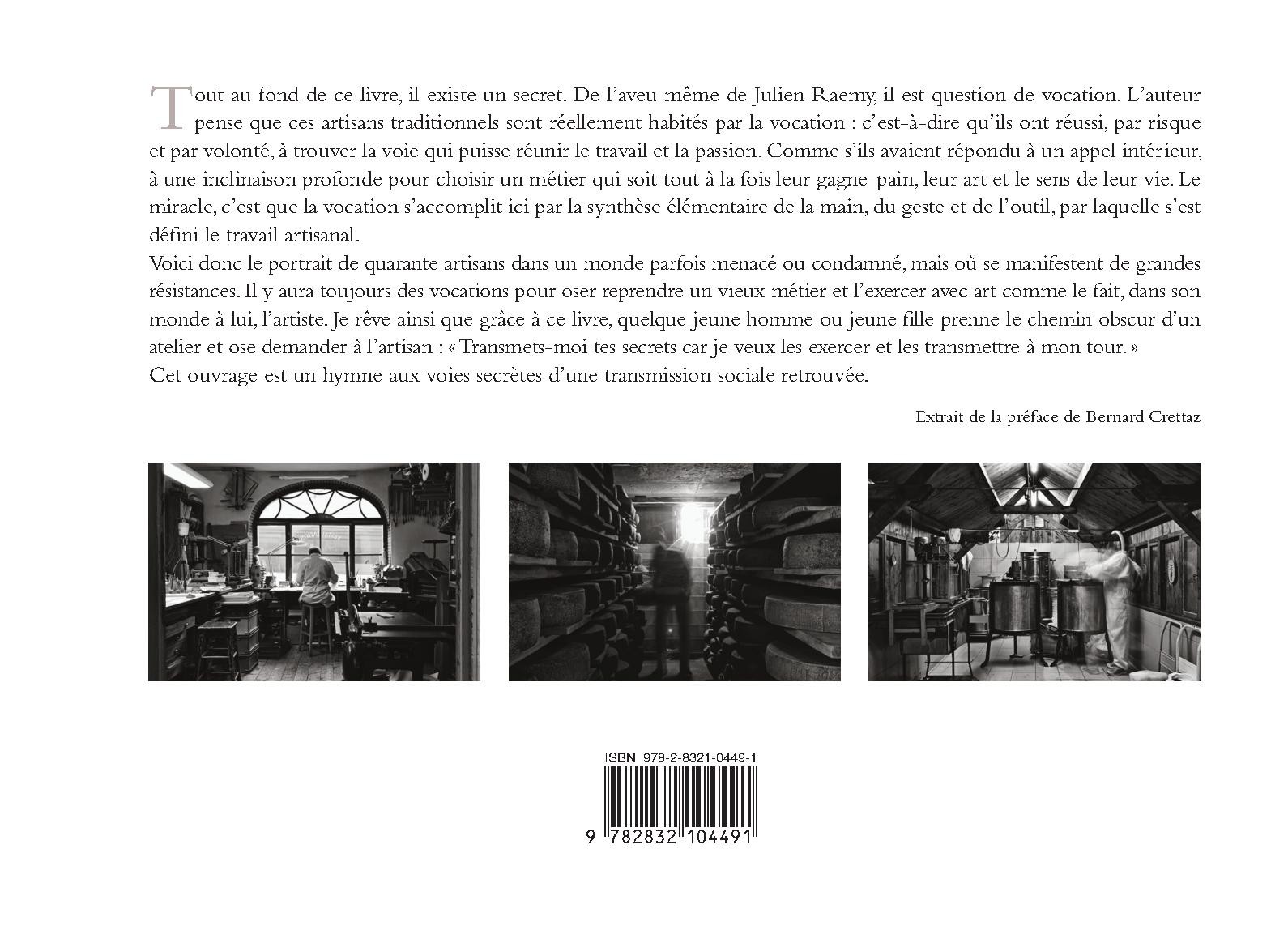 Tout au fond de ce livre, il existe un secret. De l`aveu même de Julien Raemy, il est question de vocation. L`auteur pense que ces artisans traditionnels sont réellement habités par la vocation : c`est-à-dire qu`ils ont réussi, par risque et par volonté, à trouver la voie qui puisse réunir le travail et la passion. Comme s`ils avaient répondu à un appel intérieur, à une inclinaison profonde pour choisir un métier qui soit tout à la fois leur gagne-pain, leur art et le sens de leur vie. Le miracle, c`est que la vocation s`accomplit ici par la synthèse élémentaire de la main, du geste et de l`outil, par laquelle s`est défini le travail artisanal. Voici donc le portrait de quarante artisans dans un monde parfois menacé ou condamné, mais où se manifestent de grandes résistances. Il y aura toujours des vocations pour oser reprendre un vieux métier et l`exercer avec art comme le fait, dans son monde à lui, l`artiste. Je rêve ainsi que grâce à ce livre, quelque jeune homme ou jeune fille prenne le chemin obscur d`un atelier et ose demander à l`artisan : " Transmets-moi tes secrets car je veux les exercer et les transmettre à mon tour. " Cet ouvrage est un hymne aux voies secrètes d`une transmission sociale retrouvée. Extrait de la préface de Bernard Crettaz.