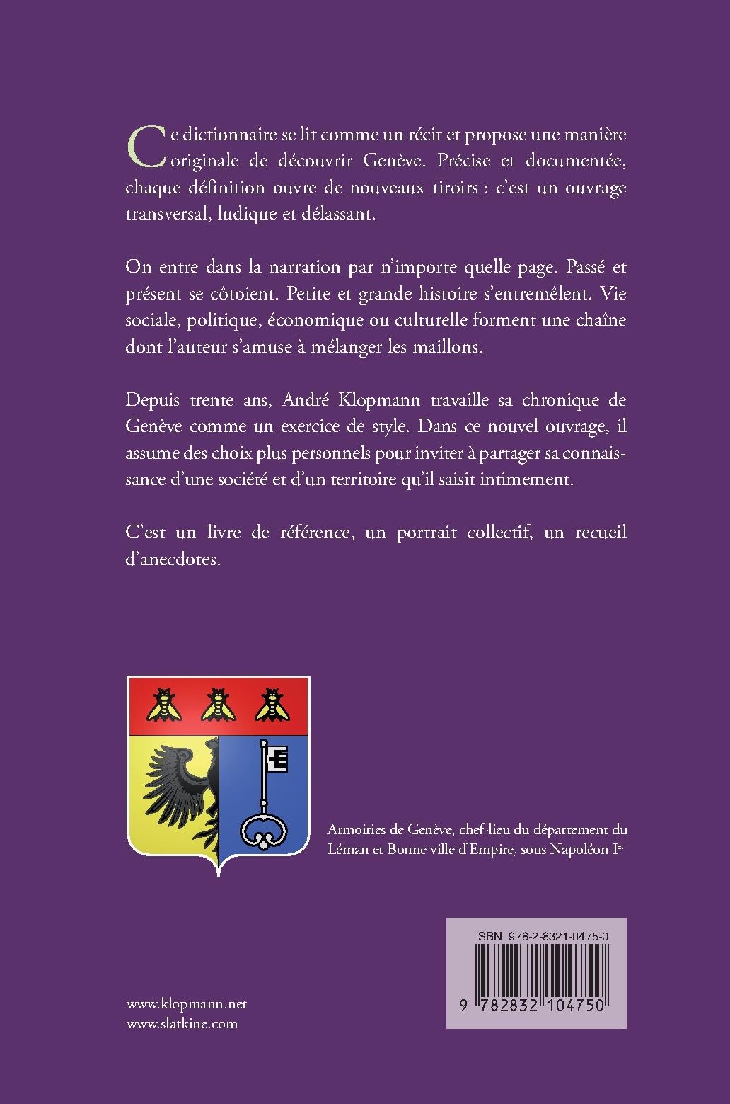 Ce dictionnaire se lit comme un récit et propose une manière originale de découvrir Genève. Précise et documentée, chaque définition ouvre de nouveaux tiroirs : c`est un ouvrage transversal, ludique et délassant. On entre dans la narration par n`importe quelle page. Passé et présent se côtoient. Petite et grande histoire s`entremêlent. Vie sociale, politique, économique ou culturelle forment une chaîne dont l`auteur s`amuse à mélanger les maillons. Depuis trente ans, André Klopmann travaille sa chronique de Genève comme un exercice de style. Dans ce nouvel ouvrage, il assume des choix plus personnels pour inviter à partager sa connaissance d`une société et d`un territoire qu`il saisit intimement. C`est un livre de référence, un portrait collectif, un recueil d`anecdotes.