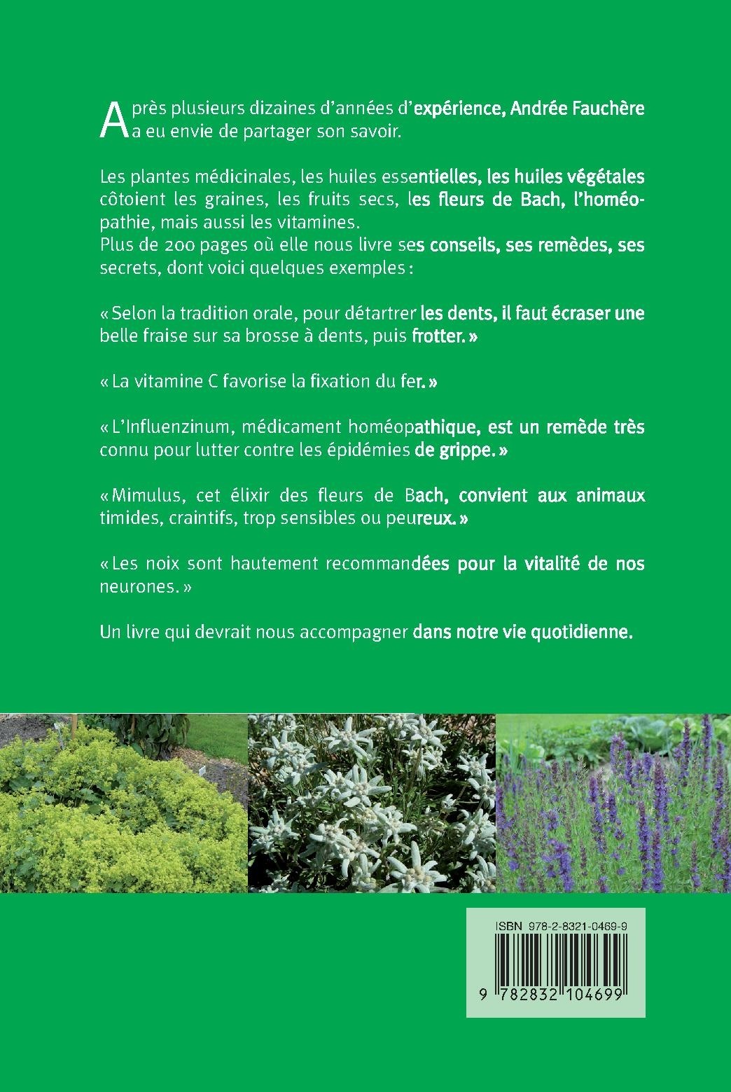 Après plusieurs dizaines d`années d`expérience, Andrée Fauchère a eu envie de partager son savoir. Les plantes médicinales, les huiles essentielles, les huiles végétales côtoient les graines, les fruits secs, les fleurs de Bach, l`homéopathie, mais aussi les vitamines. Plus de 200 pages où elle nous livre ses conseils, ses remèdes, ses secrets, dont voici quelques exemples: " Selon la tradition orale, pour détartrer les dents, il faut écraser une belle fraise sur sa brosse à dents, puis frotter. " " La vitamine C favorise la fixation du fer. " " L`Influenzinum, médicament homéopathique, est un remède très connu pour lutter contre les épidémies de grippe. " " Mimulus, cet élixir des fleurs de Bach, convient aux animaux timides, craintifs, trop sensibles ou peureux. " " Les noix sont hautement recommandées pour la vitalité de nos neurones. " Un livre qui devrait nous accompagner dans notre vie quotidienne.