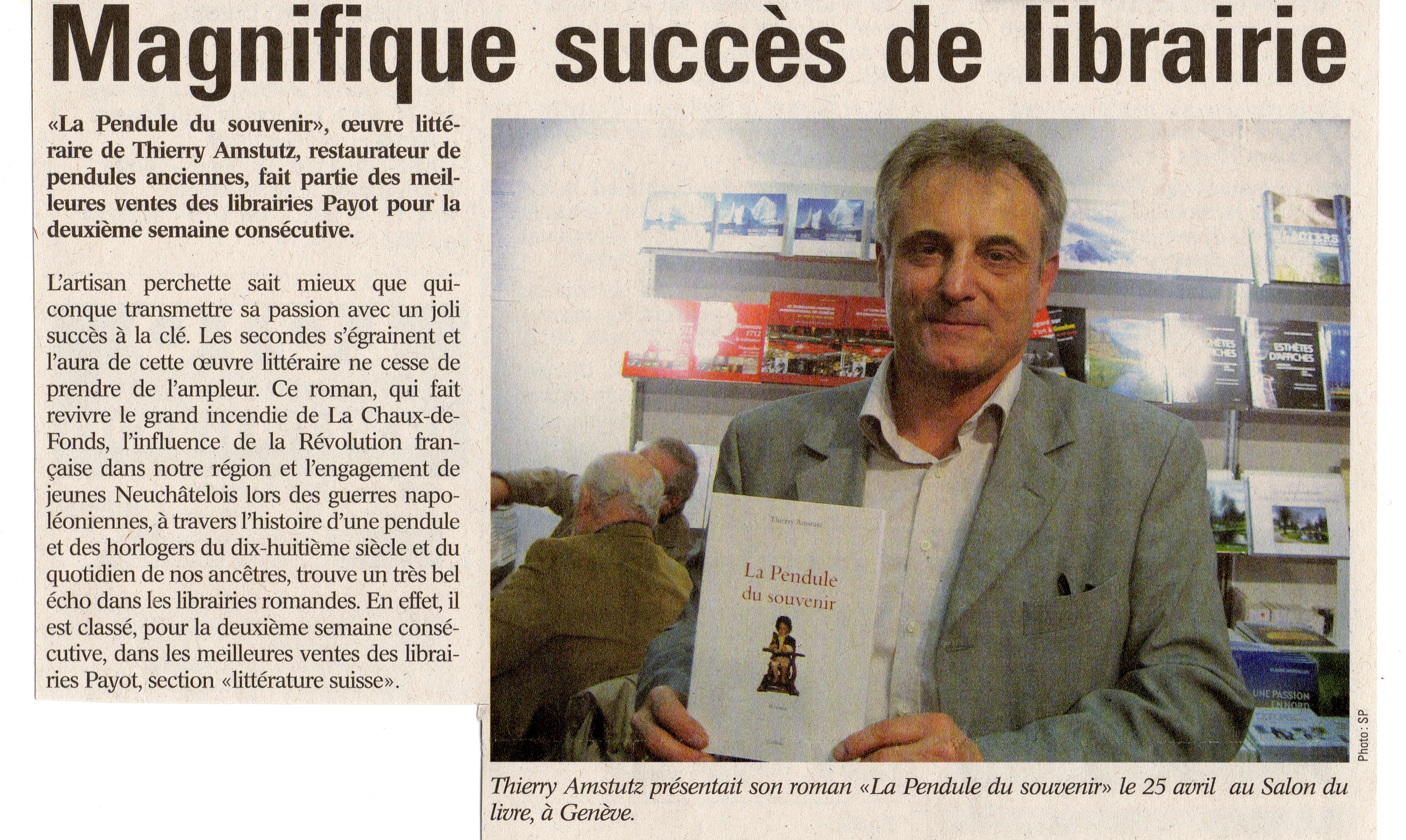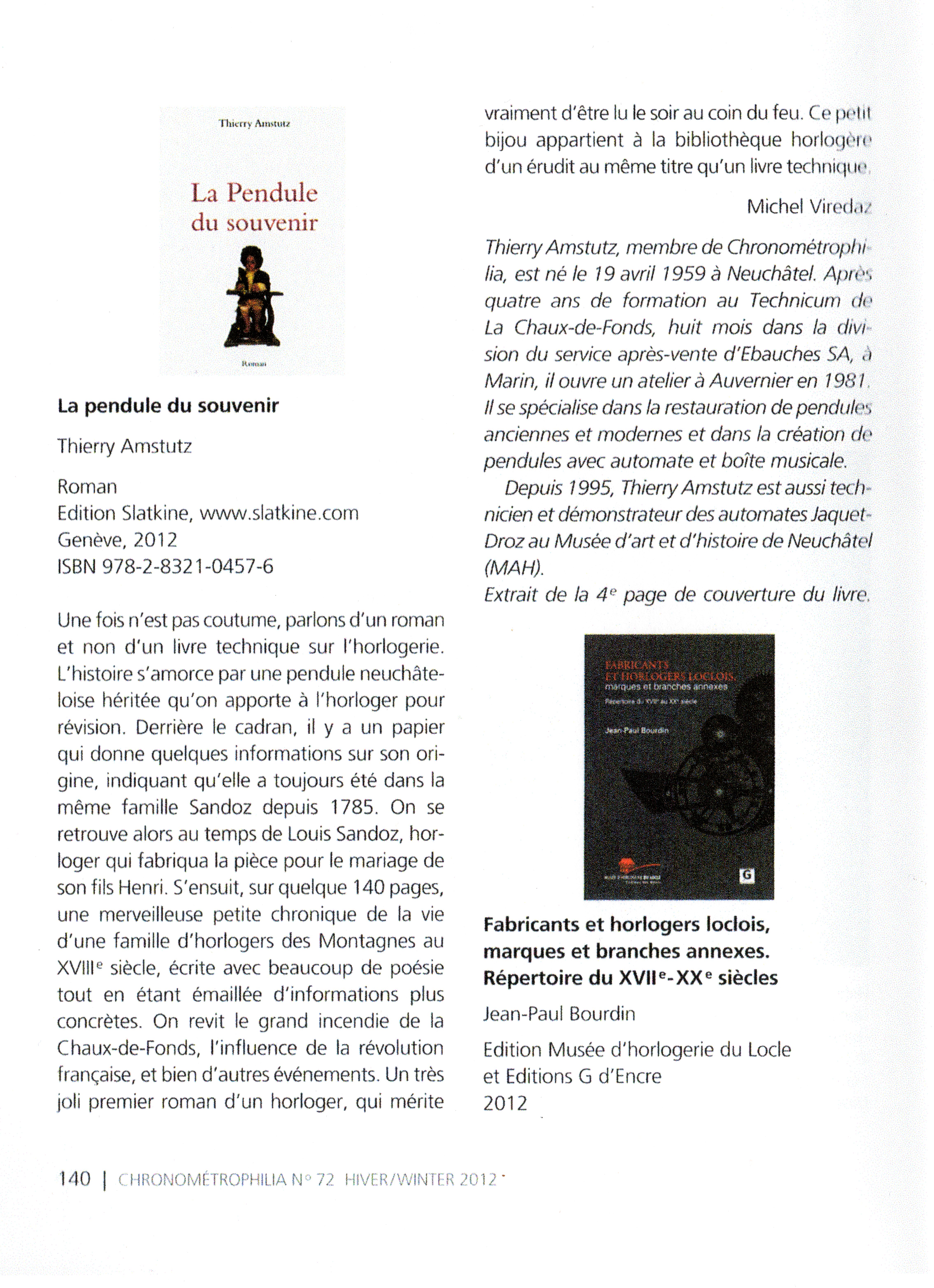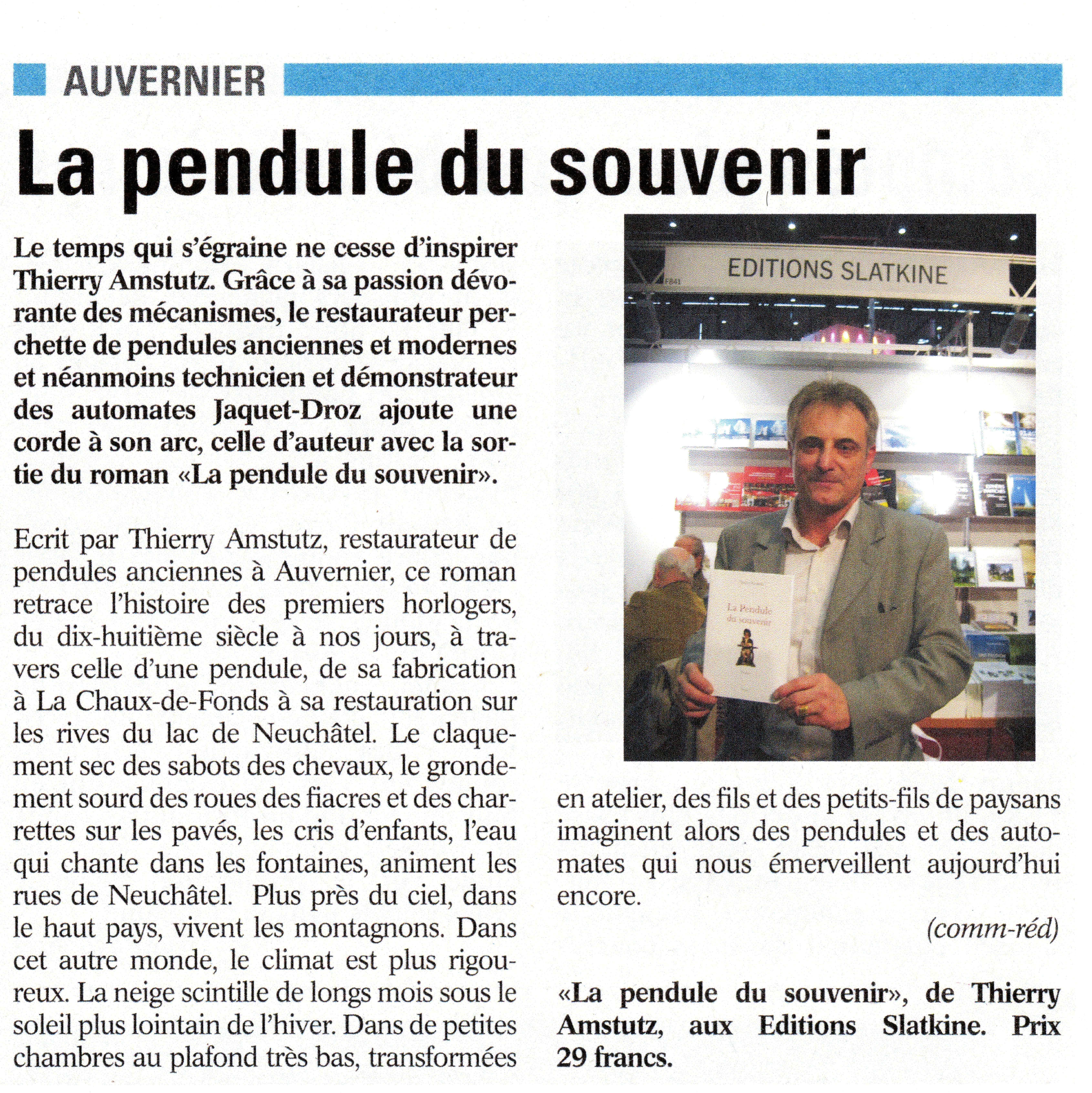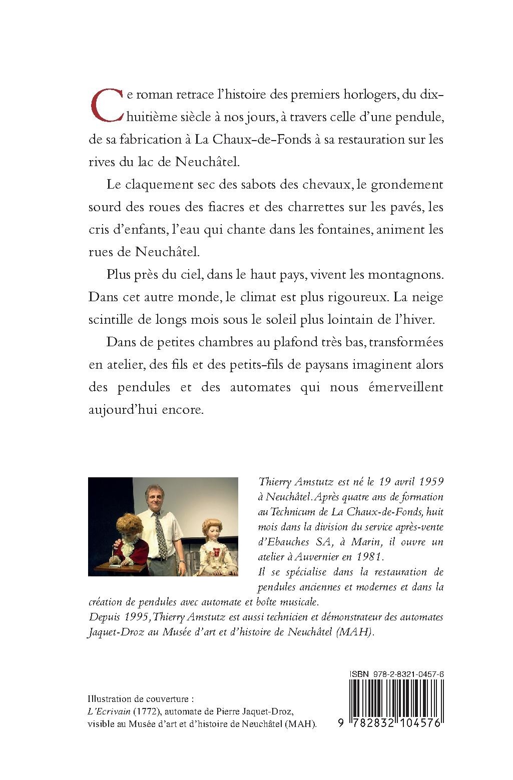 Ce roman est l’histoire d’une pendule et des premiers horlogers, du dix-huitième siècle à nos jours, de sa fabrication à La Chaux-de-Fonds à sa restauration sur les rives du lac de Neuchâtel. Le claquement sec des sabots des chevaux, le grondement sourd des roues des fiacres et des charrettes sur les pavés, les cris d’enfants, l’eau qui chante dans les fontaines, animent les rues de Neuchâtel. Plus près du ciel, dans le haut pays, vivent les montagnons. Dans cet autre monde, le climat est plus rigoureux. La neige scintille de longs mois sous le soleil plus lointain de l’hiver. Dans de petites chambres au plafond très bas, transformées en atelier, des fils et des petits-fils de paysans imaginent alors des pendules et des automates qui nous émerveillent aujourd’hui encore. Thierry Amstutz est né le 19 avril 1959 à Neuchâtel. Après quatre ans de formation au Technicum de La Chaux-de-Fonds, huit mois dans la division du service après-vente d’Ebauches SA, à Marin, il ouvre un atelier à Auvernier, en 1981. Il se spécialise dans la restauration de pendules anciennes et modernes et dans la création de pendules avec automate et boîte musicale. Depuis 1995, Thierry Amstutz est aussi technicien et démonstrateur des automates Jaquet-Droz au Musée d’art et d’histoire de Neuchâtel (MAH).