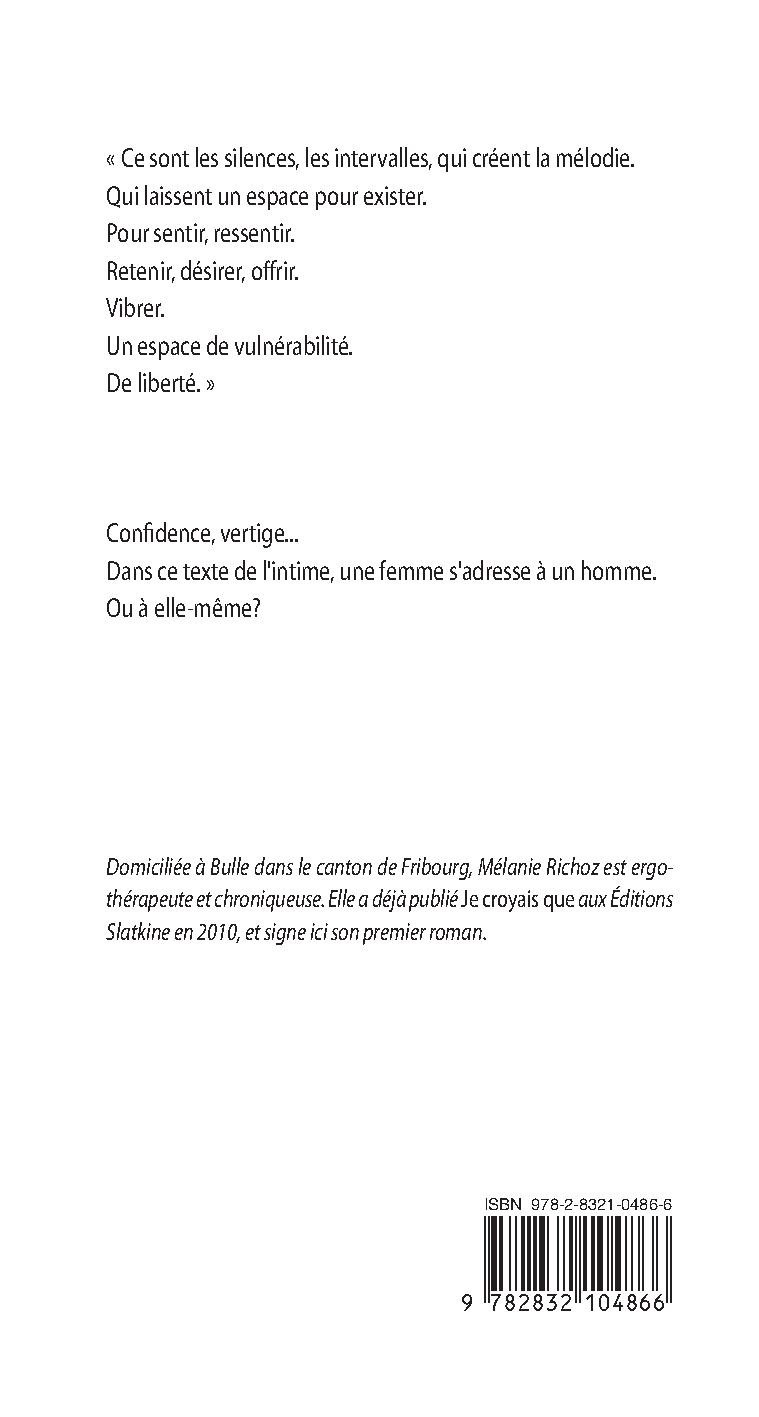 « Ce sont les silences, les intervalles, qui créent la mélodie. Qui laissent un espace pour exister. Pour sentir, ressentir. Retenir, désirer, offrir. Vibrer. Un espace de vulnérabilité. De liberté. » Confidence, vertige... Dans ce texte de l`intime, une femme s`adresse à un homme. Ou à elle-même? Domiciliée à Bulle dans le canton de Fribourg, Mélanie Richoz est ergothérapeute et chroniqueuse. Elle a déjà publié Je croyais que aux Éditions Slatkine en 2010, et signe ici son premier roman.