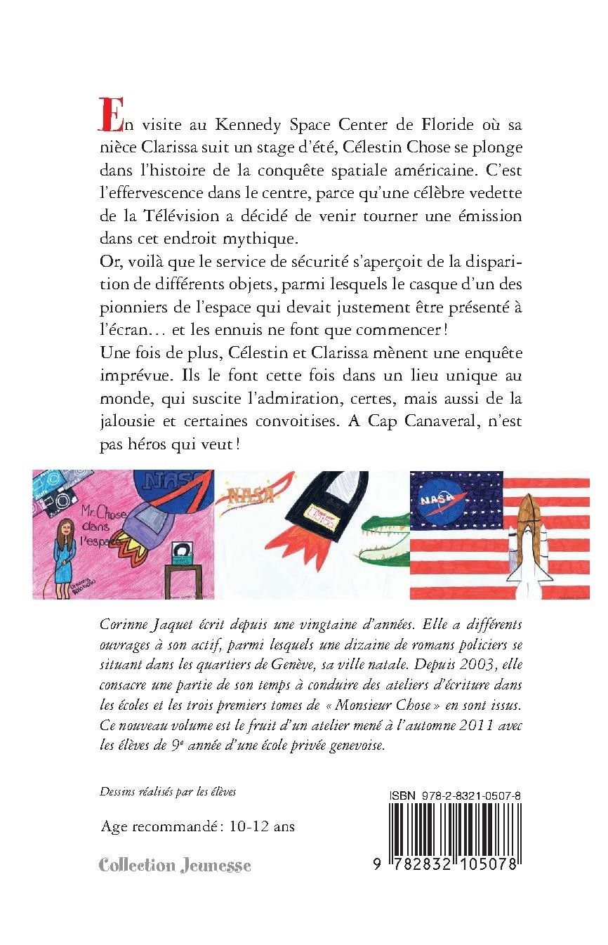En visite au Kennedy Space Center de Floride où sa nièce Clarissa suit un stage d’été, Célestin Chose se plonge dans l’histoire de la conquête spatiale américaine. C’est l’effervescence dans le centre, parce qu’une célèbre vedette de la Télévision a décidé de venir tourner une émission dans cet endroit mythique. Or, voilà que le service de sécurité s’aperçoit de la disparition de différents objets, parmi lesquels le casque d’un des pionniers de l’espace qui devait justement être présenté à l’écran… et les ennuis ne font que commencer ! Une fois de plus, Célestin et Clarissa mènent une enquête imprévue. Ils le font cette fois dans un lieu unique au monde, qui suscite l’admiration, certes, mais aussi de la jalousie et certaines convoitises. A Cap Canaveral, n’est pas héros qui veut ! Corinne Jaquet écrit depuis une vingtaine d’années. Elle a différents ouvrages à son actif, parmi lesquels une dizaine de romans policiers se situant dans les quartiers de Genève, sa ville natale. Depuis 2003, elle consacre une partie de son temps à conduire des ateliers d’écriture dans les écoles et les trois premiers tomes de « Monsieur Chose » en sont issus. Ce nouveau volume est le fruit d’un atelier mené à l’automne 2011 avec les élèves de 9e année d’une école privée genevoise.