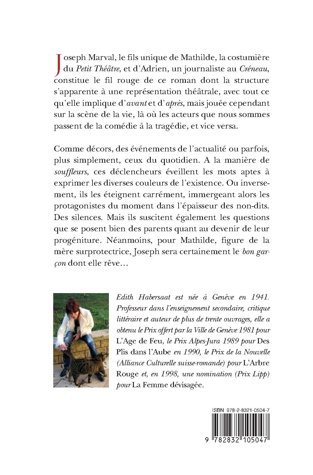 Joseph Marval, le fils unique de Mathilde, la costumière du Petit Théâtre, et d’Adrien, un journaliste au Créneau, constitue le fil rouge de ce roman dont la structure s’apparente à une représentation théâtrale, avec tout ce qu’elle implique d’avant et d’après, mais jouée cependant sur la scène de la vie, là où les acteurs que nous sommes passent de la comédie à la tragédie, et vice versa. Comme décors, des événements de l’actualité ou parfois, plus simplement, ceux du quotidien. A la manière de souffleurs, ces déclencheurs éveillent les mots aptes à exprimer les diverses couleurs de l’existence. Ou inversement, ils les éteignent carrément, immergeant alors les protagonistes du moment dans l’épaisseur des non-dits. Des silences. Mais ils suscitent également les questions que se posent bien des parents quant au devenir de leur progéniture. Néanmoins, pour Mathilde, figure de la mère surprotectrice, Joseph sera certainement le bon garçon dont elle rêve….Edith Habersaat est née à Genève en 1941. Professeur dans l’enseignement secondaire, critique littéraire et auteur de plus de trente ouvrages, elle a obtenu le Prix offert par la Ville de Genève 1981 pour L’Age de Feu, le Prix Alpes-Jura 1989 pour Des Plis dans l’Aube en 1990, le Prix de la Nouvelle (Alliance Culturelle suisse-romande) pour L’Arbre Rouge et, en 1998, une nomination (Prix Lipp) pour La Femme dévisagée.
