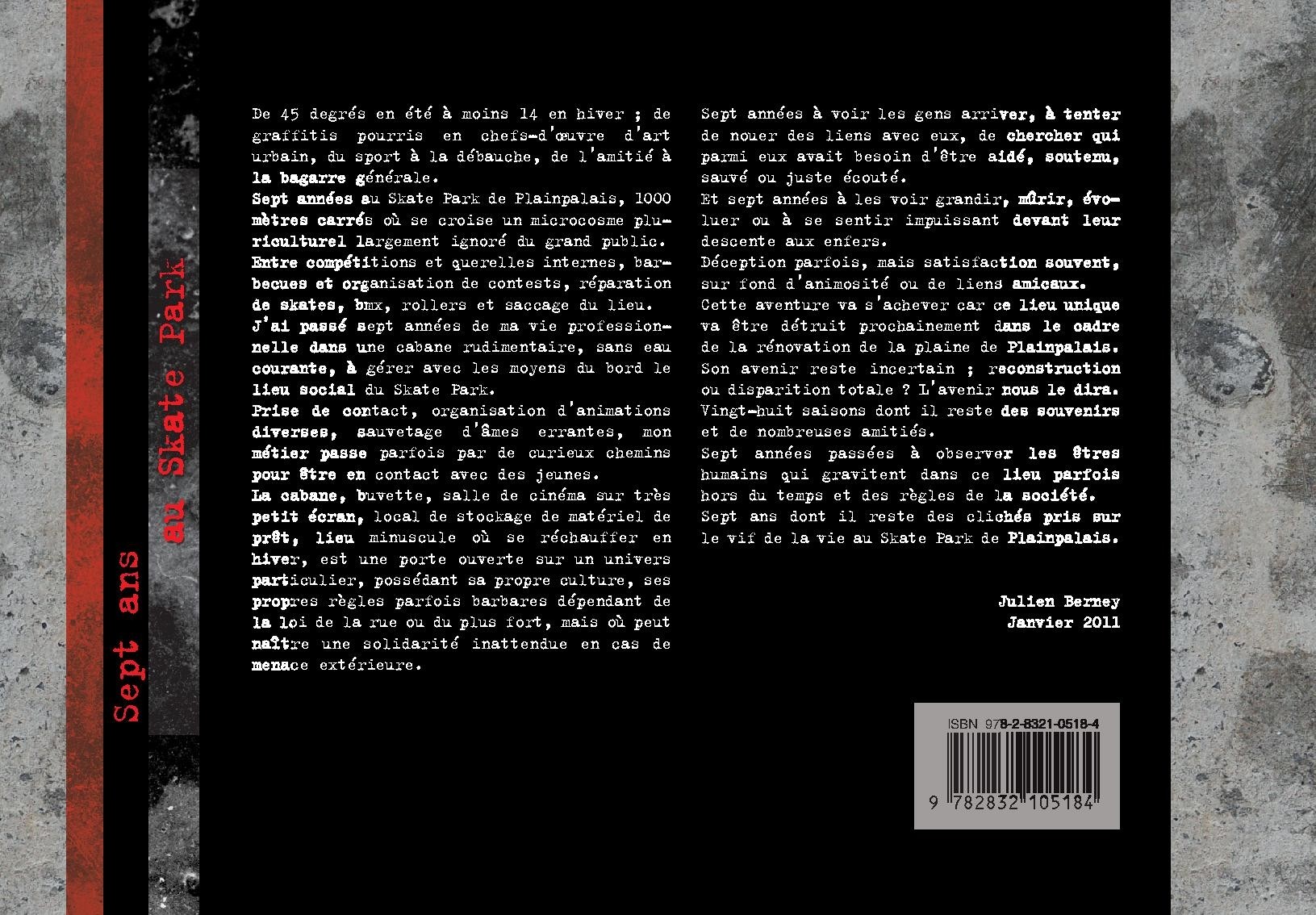 De 45 degrés en été à moins 14 en hiver ; de graffitis pourris en chefs-d’œuvre d’art urbain, du sport à la débauche, de l’amitié à la bagarre générale. Sept années au skatepark de Plainpalais, 1000 mètres carrés où se croise un microcosme pluriculturel largement ignoré du grand public. Entre compétition et querelles internes, barbecures et organisation de contests, réparation de skates, bmx, rollers et saccage du lieu. J’ai passé sept années de ma vie professionnelle dans une cabane rudimentaire, sans eau courante, à gérer avec les moyens du bord le lieu social du skatepark. Prise de contact organisation d’animations diverses, sauvetage d’âmes errantes, mon métier passe parfois par de curieux chemins pour être en contact avec des jeunes. La cabane, buvette, salle de cinéma sur très petit écran, local de stockage de matériel de prêt, lieu minuscule ou se réchauffer en hiver, est une porte ouverte sur un univers particulier, possédant sa propre culture, ses propres règles parfois barbares dépendant de la loi de la rue ou du plus fort, mais où peut naître une solidarité inattendue en cas de menace extérieure. Sept années à voir les gens arriver, à tenter de nouer des liens avec eux, de chercher qui parmi eux avait besoin d’être aidé, soutenu, sauvé ou juste écouté. Et sept années à les voir grandir, mûrir, évoluer ou à se sentir impuissant devant leur descente aux enfers. Déception parfois, mais satisfaction souvent, sous fond d’animosité ou de liens amicaux. Une aventure qui s’achève avec la rénovation de la plaine de Plainpalais. Vingt-huit saisons dont il reste des souvenirs et de nombreuses amitiés. Sept années passées à observer les êtres humains qui gravitent dans ce lieu parfois hors du temps et des règles de la société. Sept ans dont il reste des clichés pris sur le vif de la vie au skatepark de Plainpalais.