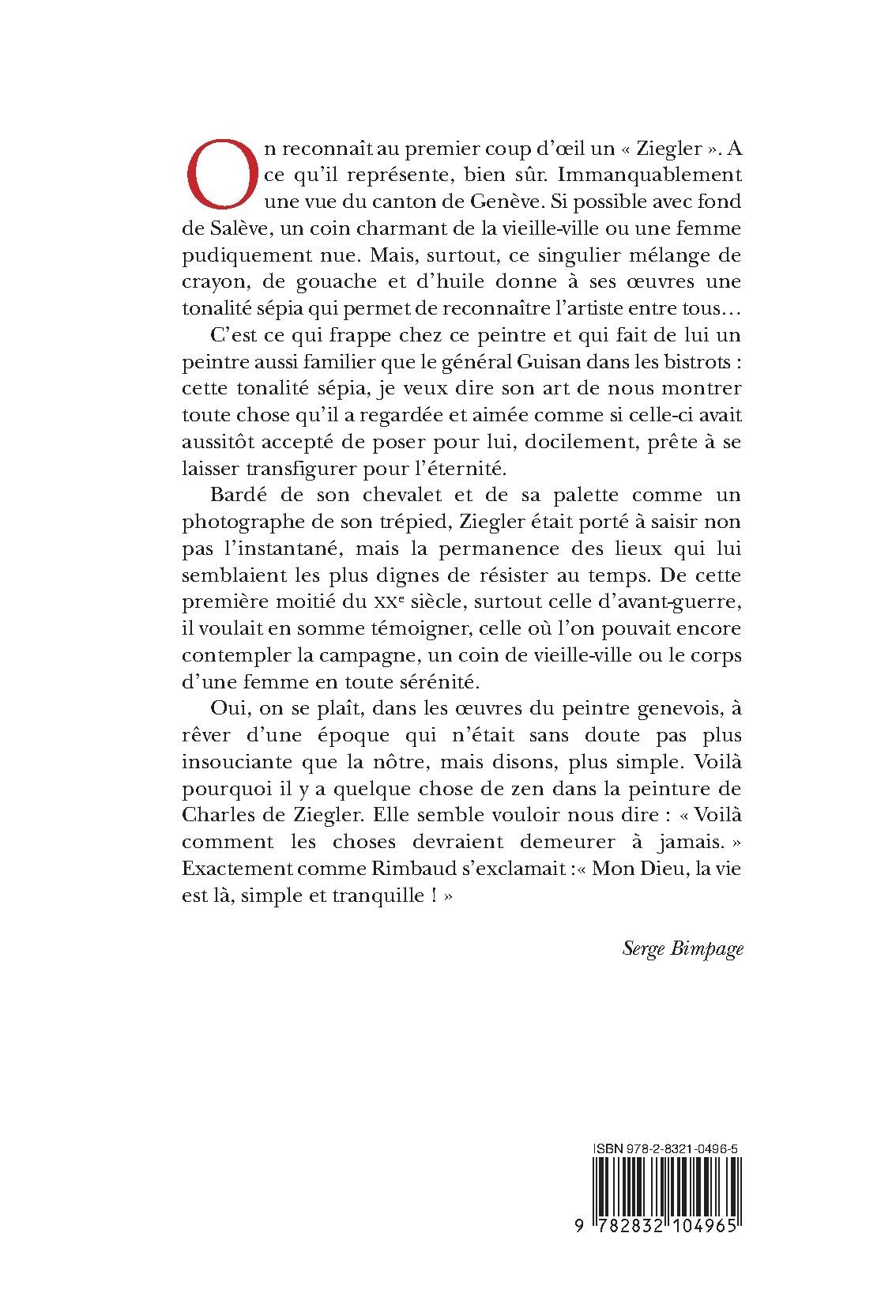 On reconnaît au premier coup d’œil un « Ziegler » . A ce qu’il représente, bien sûr. Immanquablement une vue du canton de Genève. Si possible avec fond de Salève, un coin charmant de la vieille-ville ou une femme pudiquement nue. Mais surtout, ce singulier mélange de crayon, de gouache et d’huile donne à ses œuvres une tonalité sépia qui fait reconnaître l’artiste entre tous…¨ C’est ce qui frappe, chez ce peintre. Et qui fait de lui un peintre aussi familier que le général Guisan dans les bistrots : cette tonalité sépia, je veux dire son art de nous montrer toute chose qu’il a regardée et aimée comme si celle-ci avait aussitôt accepté de poser pour lui, docilement prête à se laisser transfigurer pour l’éternité. Bardé de son chevalet et de sa palette comme un photographe de son trépied, Ziegler était porté à saisir non pas l’instantané mais la permanence des lieux qui lui semblaient les plus dignes de résister au temps. De cette première moitié de vingtième siècle, surtout celle avant-guerre, il voulait en somme témoigner ; celle où l’on pouvait encore contempler la campagne, un coin de vieille-ville ou le corps d’une femme en toute sérénité. Oui, on se plait, dans les oeuvres du peintre genevois, à rêver d’une époque qui n’était sans doute pas plus insouciante que la nôtre, mais disons, plus simple. Voilà pourquoi il y a quelque chose de zen dans la peinture de Charles de Ziegler. Elle semble vouloir nous dire « Voilà comment les choses devraient demeurer à jamais ». Exactement comme Rimbaud s’exclamait « Mon Dieu, mon Dieu, la vie est là, simple et tranquille ! » Serge Bimpage