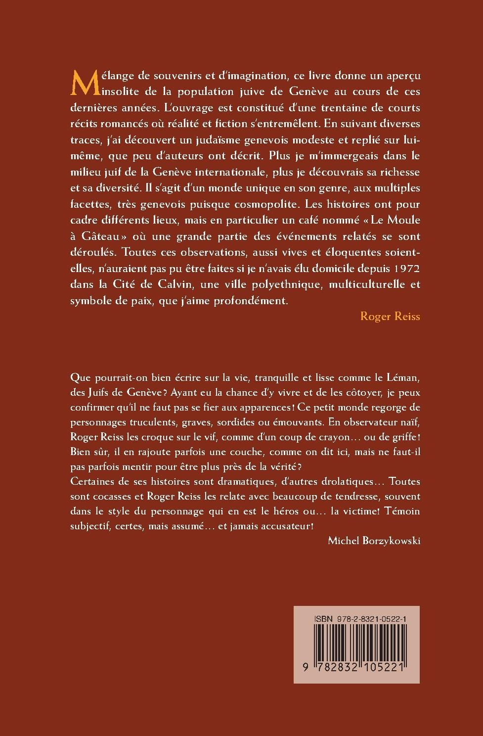 Mélange de souvenirs et d’imagination, ce livre donne un aperçu insolite de la population juive de Genève au cours de ces dernières années. L’ouvrage est constitué d’une trentaine de courts récits romancés où réalité et fiction s’entremêlent. En suivant diverses traces, j’ai découvert un judaïsme genevois modeste et replié sur lui-même, que peu d’auteurs ont décrit. Plus je m’immergeais dans le milieu juif de la Genève internationale, plus je découvrais sa richesse et sa diversité. Il s’agit d’un monde unique en son genre, aux multiples facettes, très genevois puisque cosmopolite. Les histoires ont pour cadre différents lieux, mais en particulier un café nommé «Le Moule à Gâteau » où une grande partie des événements relatés se sont déroulés. Toutes ces observations, aussi vives et éloquentes soient-elles, n’auraient pas pu être faites si je n’avais élu domicile depuis 1972 dans la Cité de Calvin, une ville polyethnique, multiculturelle et symbole de paix, que j’aime profondément. Roger Reiss