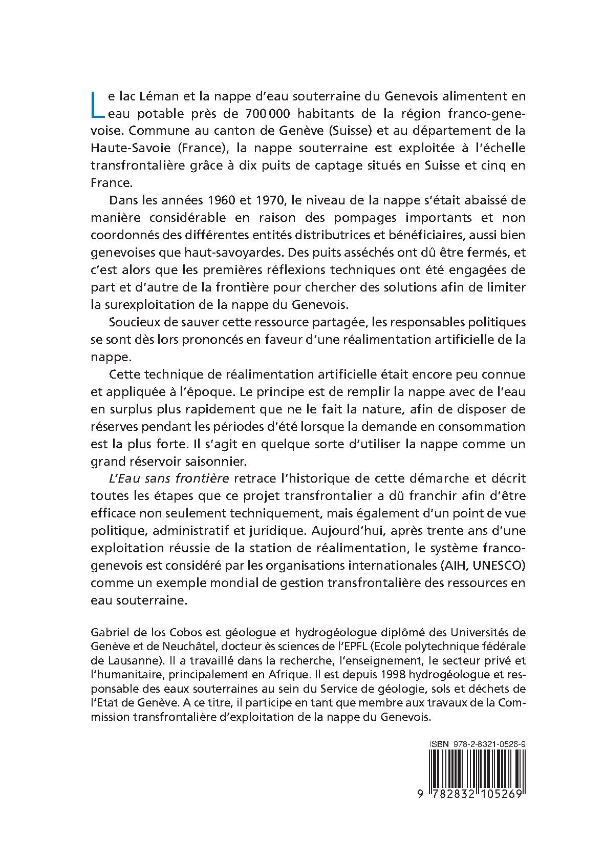 Le lac Léman et la nappe d’eau souterraine du Genevois alimentent en eau potable près de 700000 habitants de la région franco-genevoise. Commune au canton de Genève (Suisse) et au département de la Haute-Savoie (France), la nappe souterraine est exploitée à l’échelle transfrontalière grâce à dix puits de captage situés en Suisse et cinq en France. Dans les années 1960 et 1970, le niveau de la nappe s’était abaissé de manière considérable en raison des pompages importants et non coordonnés des différentes entités distributrices et bénéficiaires, aussi bien genevoises que haut-savoyardes. Des puits asséchés ont dû être fermés, et c’est alors que les premières réflexions techniques ont été engagées de part et d’autre de la frontière pour chercher des solutions afin de limiter la surexploitation de la nappe du Genevois. Soucieux de sauver cette ressource partagée, les responsables politiques se sont dès lors prononcés en faveur d’une réalimentation artificielle de la nappe. Cette technique de réalimentation artificielle était encore peu connue et appliquée à l’époque. Le principe est de remplir la nappe avec de l’eau en surplus plus rapidement que ne le fait la nature, afin de disposer de réserves pendant les périodes d’été lorsque la demande en consommation est la plus forte. Il s’agit en quelque sorte d’utiliser la nappe comme un grand réservoir saisonnier. L’Eau sans frontière retrace l’historique de cette démarche et décrit toutes les étapes que ce projet transfrontalier a dû franchir afin d’être efficace non seulement techniquement, mais également d’un point de vue politique, administratif et juridique. Aujourd’hui, après trente ans d’une exploitation réussie de la station de réalimentation, le système franco-genevois est considéré par les organisations internationales (AIH, UNESCO) comme un exemple mondial de gestion transfrontalière des ressources en eau souterraine.