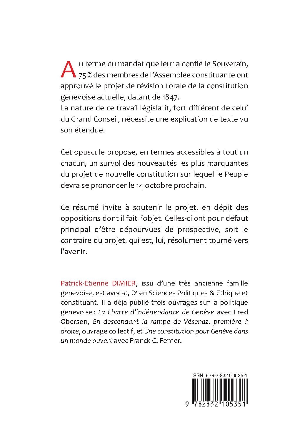 Au terme du mandat que leur a confié le Souverain, 75 % des membres de l’Assemblée constituante ont approuvé le projet de révision totale de la constitution genevoise actuelle, datant de 1847. La nature de ce travail législatif, fort différent de celui du Grand Conseil, nécessite une explication de texte vu son étendue. Cet opuscule propose, en termes accessibles a tout un chacun, un survol des nouveautés les plus marquantes du projet de nouvelle constitution sur lequel le Peuple devra se prononcer le 14 octobre prochain. Ce résume invite a soutenir le projet, en dépit des oppositions dont il fait l’objet. Celles-ci ont pour défaut principal d’être dépourvues de prospective, soit le contraire du projet, qui est, lui, résolument tourne vers l’avenir. Patrick-Etienne DIMIER, issu d’une très ancienne famille genevoise, est avocat, Dr en Sciences Politiques & Éthique et constituant. Il a déjà publié trois ouvrages sur la politique genevoise : La Charte d’indépendance de Genève avec Fred Oberson, En descendant la rampe de Vésenaz, première à droite, ouvrage collectif, et Une constitution pour Genève dans un monde ouvert avec Franck C. Ferrier.