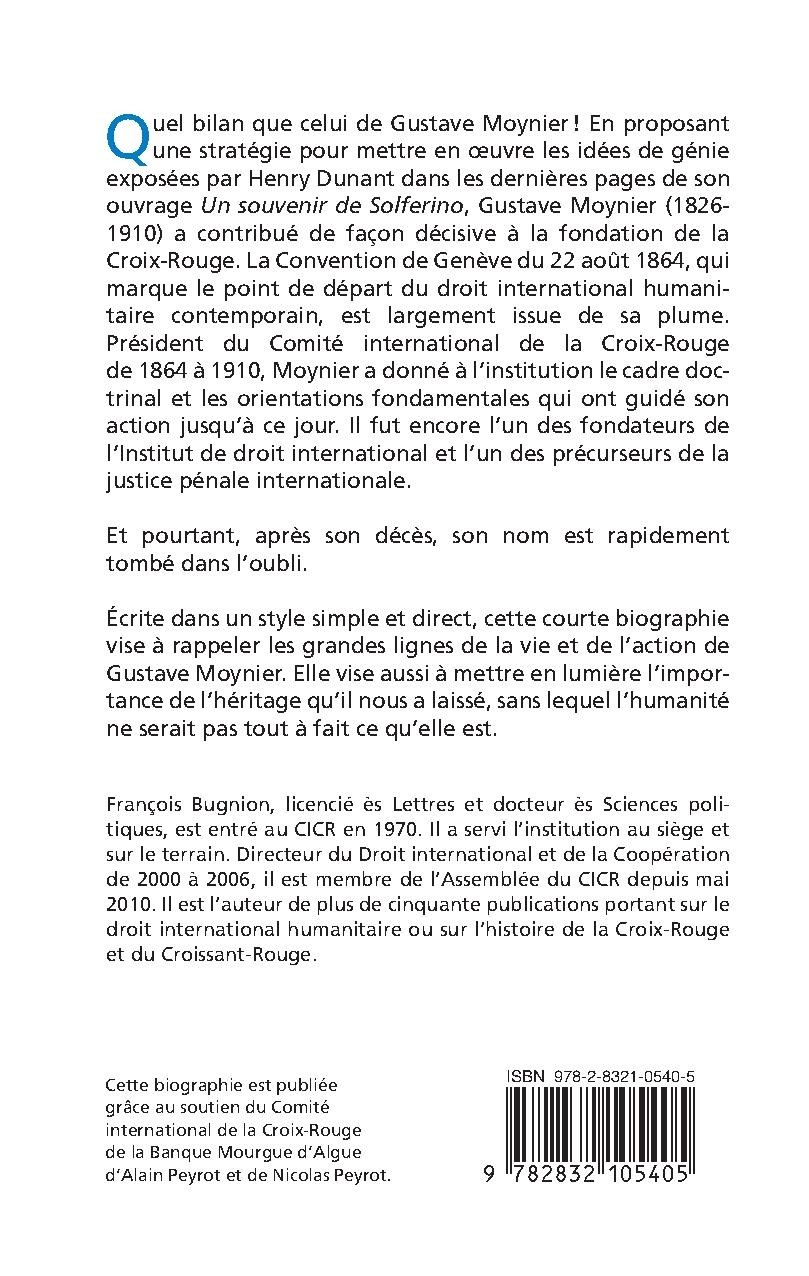 Peut-on imaginer un destin plus exceptionnel et plus tragique que celui d`Henry Dunant? Confronté à l`horreur du champ de bataille de Solférino, il sut tirer de ce traumatisme un livre-témoignage - Un souvenir de Solferino - ainsi que deux idées de génie - la Croix-Rouge et la Convention de Genève - qui lui permettront d`accéder à la notoriété. Il n`en jouira pas longtemps. En 1867, une faillite retentissante le plonge dans la misère. Après avoir été invité à la table des Grands, Dunant connaîtra la faim et l`humiliation des habits rapiécés. Cette déchéance ne l`empêchera pourtant pas de se faire l`avocat d`autres idées généreuses : la protection des prisonniers de guerre, un projet de bibliothèque universelle, les droits des femmes, l`arbitrage international, etc. Après des années d`exil, d`errances et de privations, il saura orchestrer une stratégie de reconquête qui culminera en 1901 avec l`octroi du premier prix Nobel de la paix. Il s`éteint à Heiden le 30 octobre 1910. Cette courte biographie vise à présenter les aspects essentiels du philanthrope : ses qualités de visionnaire, ses élans d`enthousiasme et de générosité; sans occulter ses égarements, ses travers et le délire de persécution qui assombrit ses dernières années. Elle vise surtout à rappeler l`héritage de Dunant, qui fait honneur à l`humanité. // Quel bilan que celui de Gustave Moynier! En proposant une stratégie pour mettre en œuvre les idées de génie exposées par Henry Dunant dans les dernières pages de son ouvrage Un souvenir de Solferino, Gustave Moynier (1826- 1910) a contribué de façon décisive à la fondation de la Croix-Rouge. La Convention de Genève du 22 août 1864, qui marque le point de départ du droit international humanitaire contemporain, est largement issue de sa plume. Président du Comité international de la Croix-Rouge de 1864 à 1910, Moynier a donné à l`institution le cadre doctrinal et les orientations fondamentales qui ont guidé son action jusqu`à ce jour. Il fut encore l`un des fondateurs de l`Institut de droit international..