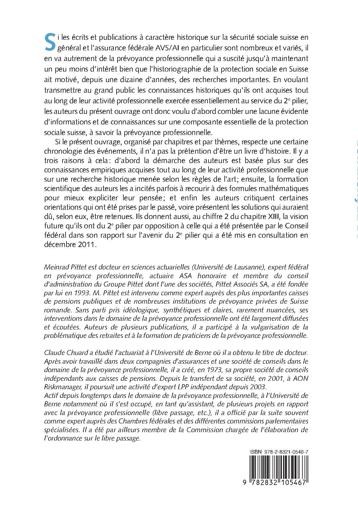 Si les écrits et publications à caractère historique sur la sécurité sociale suisse en général et l’assurance fédérale AVS/AI en particulier sont nombreux et variés, il en va autrement de la prévoyance professionnelle qui a suscité jusqu’à maintenant un peu moins d’intérêt bien que l’historiographie de la protection sociale en Suisse ait motivé, depuis une dizaine d’années, des recherches importantes. En voulant transmettre au grand public les connaissances historiques qu’ils ont acquises tout au long de leur activité professionnelle exercée essentiellement au service du 2e pilier, les auteurs du présent ouvrage ont donc voulu d’abord combler une lacune évidente d’informations et de connaissances sur une composante essentielle de la protection sociale suisse, à savoir la prévoyance professionnelle. Si le présent ouvrage, organisé par chapitres et par thèmes, respecte une certaine chronologie des événements, il n’a pas la prétention d’être un livre d’histoire. Il y a trois raisons à cela: d’abord la démarche des auteurs est basée plus sur des connaissances empiriques acquises tout au long de leur activité professionnelle que sur une recherche historique menée selon les règles de l’art; ensuite, la formation scientifique des auteurs les a incités parfois à recourir à des formules mathématiques pour mieux expliciter leur pensée; et enfin les auteurs critiquent certaines orientations qui ont été prises par le passé, voire présentent les solutions qui auraient dû, selon eux, être retenues. Ils donnent aussi, au chiffre 2 du chapitre XIII, la vision future qu’ils ont du 2e pilier par opposition à celle qui a été présentée par le Conseil fédéral dans son rapport sur l’avenir du 2e pilier qui a été mis en consultation en décembre 2011.