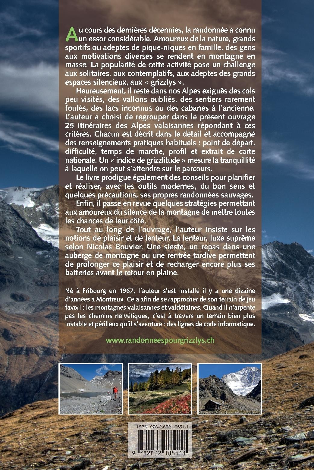 Au cours des dernières décennies, la randonnée a connu un essor considérable. Amoureux de la nature, grands sportifs ou adeptes de pique-niques en famille, des gens aux motivations diverses se rendent en montagne en masse. La popularité de cette activité pose un challenge aux solitaires, aux contemplatifs, aux adeptes des grands espaces silencieux, aux « grizzlys ». Heureusement, il reste dans nos Alpes exiguës des cols peu visités, des vallons oubliés, des sentiers rarement foulés, des lacs inconnus ou des cabanes à l’ancienne. L’auteur a choisi de regrouper dans le présent ouvrage 25 itinéraires des Alpes valaisannes répondant à ces critères. Chacun est décrit dans le détail et accompagné des renseignements pratiques habituels : point de départ, difficulté, temps de marche, profil et extrait de carte nationale. Un « indice de grizzlitude » mesure la tranquillité à laquelle on peut s’attendre sur le parcours. Le livre prodigue également des conseils pour planifier et réaliser, avec les outils modernes, du bon sens et quelques précautions, ses propres randonnées sauvages. Enfin, il passe en revue quelques stratégies permettant aux amoureux du silence de la montagne de mettre toutes les chances de leur côté. Tout au long de l’ouvrage, l’auteur insiste sur les notions de plaisir et de lenteur. La lenteur, luxe suprême selon Nicolas Bouvier. Une sieste, un repas dans une auberge de montagne ou une rentrée tardive permettent de prolonger ce plaisir et de recharger encore plus ses batteries avant le retour en plaine.