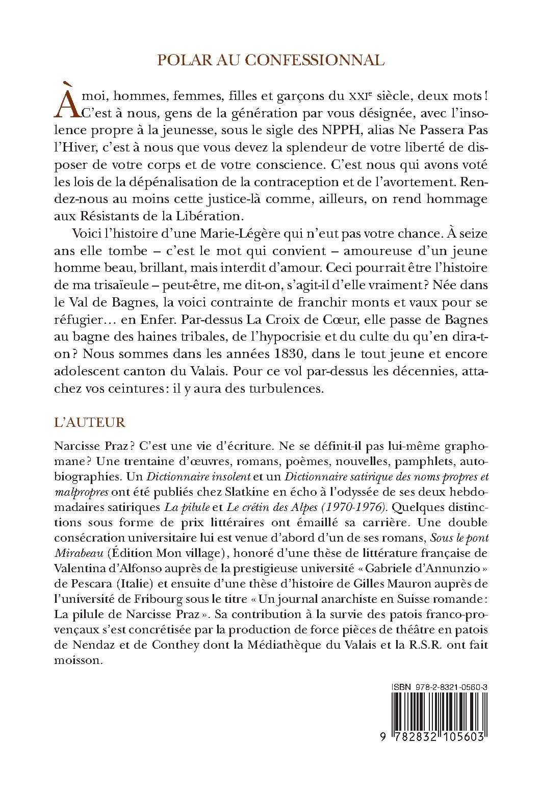À moi, hommes, femmes, filles et garçons du XXIe siècle, deux mots ! C’est à nous, gens de la génération par vous désignée, avec l’insolence propre à la jeunesse, sous le sigle des NPPH, alias Ne Passera Pas l’Hiver, c’est à nous que vous devez la splendeur de votre liberté de disposer de votre corps et de votre conscience. C’est nous qui avons voté les lois de la dépénalisation de la contraception et de l’avortement. Rendez-nous au moins cette justice-là comme, ailleurs, on rend hommage aux Résistants de la Libération. Voici l’histoire d’une Marie-Légère qui n’eut pas votre chance. À seize ans elle tombe – c’est le mot qui convient – amoureuse d’un jeune homme beau, brillant, mais interdit d’amour. Ceci pourrait être l’histoire de ma trisaïeule – peut-être, me dit-on, s’agit-il d’elle vraiment ? Née dans le Val de Bagnes, la voici contrainte de franchir monts et vaux pour se réfugier… en Enfer. Par-dessus La Croix de Cœur, elle passe de Bagnes au bagne des haines tribales, de l’hypocrisie et du culte du qu’en dira-ton? Nous sommes dans les années 1830, dans le tout jeune et encore adolescent canton du Valais. Pour ce vol par-dessus les décennies, attachez vos ceintures : il y aura des turbulences.