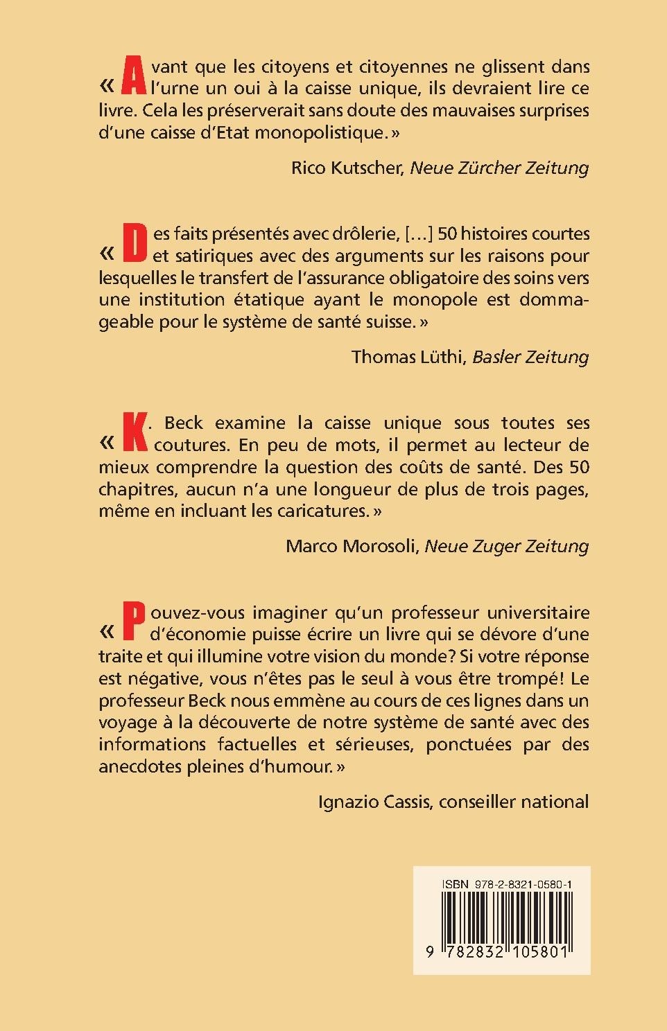 «K. Beck examine la caisse unique sous toutes ses coutures. En peu de mots, il permet au lecteur de mieux comprendre la question des coûts de santé. Des 50 chapitres, aucun n’a une longueur de plus de trois pages, même en incluant les caricatures.» Marco Morosoli, Neue Zuger Zeitung