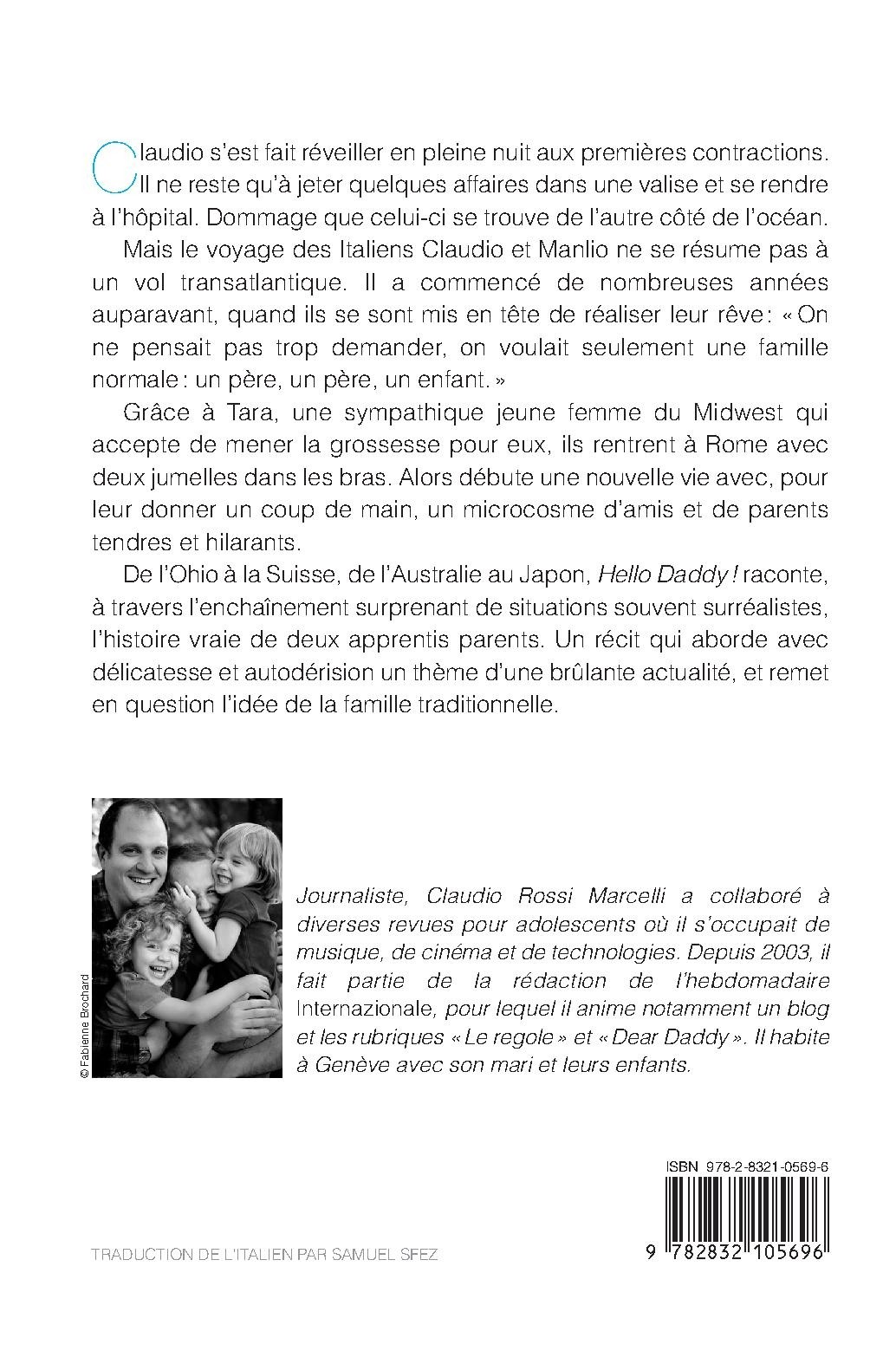 Claudio s’est fait réveiller en pleine nuit aux premiers signes de contractions. Il ne reste qu’à jeter quelques affaires dans une valise et se rendre à l’hôpital. Dommage que celui-ci se trouve de l’autre côté de l’Atlantique. Mais le voyage des Italiens Claudio et Manlio a commencé de nombreuses années auparavant, quand ils se sont mis en tête de réaliser leur rêve : « On ne pensait pas trop demander, on voulait seulement une famille normale : un père, un père, un enfant. » Grâce à Tara, une sympathique jeune femme du Midwest qui accepte de mener la grossesse pour eux, ils rentrent à Rome avec deux jumelles dans les bras. Pour leur donner un coup de main, il y a un microcosme d’amis et de parents tendres et hilarants. De l’Ohio à la Suisse, de l’Australie au Japon, Hello Daddy ! raconte, à travers l’enchaînement surprenant de situations souvent surréalistes, l’histoire vraie de deux apprentis parents. Un récit qui aborde avec délicatesse et autodérision un thème d’une brûlante actualité, l’homoparentalité, et remet en question l’idée de la famille traditionnelle. Journaliste, Claudio Rossi Marcelli a collaboré à diverses revues pour adolescents où il s’occupait de musique, de cinéma et de technologies. Depuis 2003, il fait partie de la rédaction de l’hebdomadaire L’Internazionale, pour lequel il anime notamment un blog et les rubriques « Le regole » et « Dear Daddy ». Il habite à Genève avec son mari et leurs enfants.