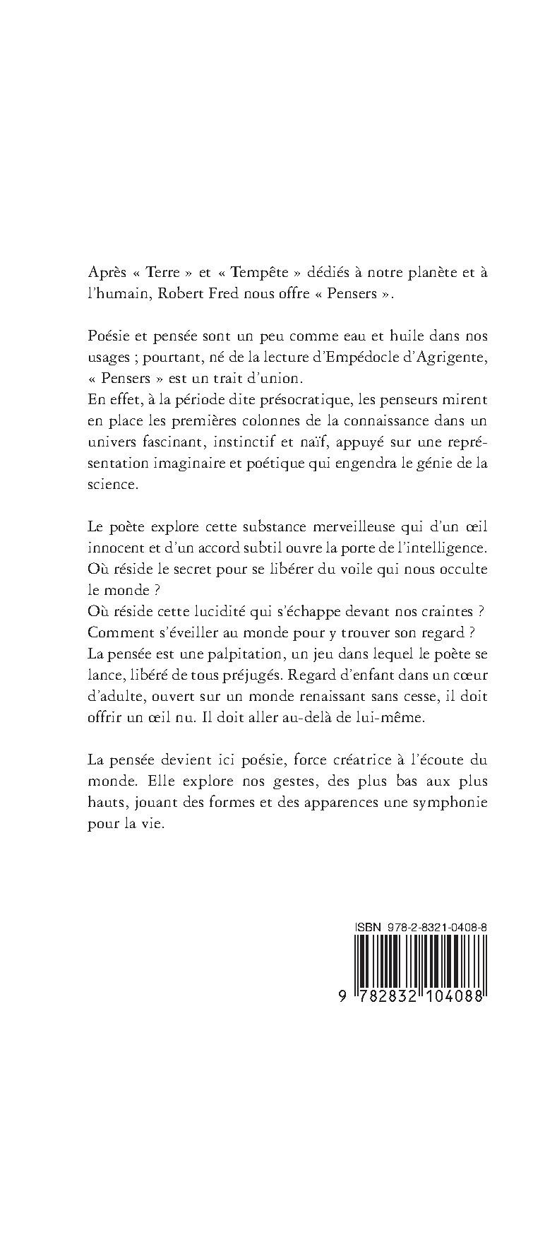 Après Terre et Tempête dédiés à notre planète et à l'humain, Robert Fred nous offre Pensers. Poésie et pensée sont un peu comme eau et huile dans nos usages, pourtant, né de la lecture d'Empédocle d'Agrigente, Pensers est un trait d'union. En effet, à la période dite présocratique, les penseurs mirent en place les premières colonnes de la connaissance dans un univers fascinant, instinctif et naïf, appuyé sur une représentation imaginaire et poétique qui engendra le génie de la science. Le poète explore cette substance merveilleuse qui, d'un œil innocent et d'un accord subtil, ouvre la porte de l'intelligence. Où réside le secret pour se libérer du voile qui nous occulte le monde? Où réside cette lucidité qui s'échappe devant nos craintes? Comment s'éveiller au monde pour y trouver son regard? La pensée est une palpitation, un jeu dans lequel le poète se lance, libéré de tous préjugés. Regard d'enfant dans un cœur d'adulte, ouvert sur un monde renaissant sans cesse, il doit offrir un œil nu. Il doit aller au-delà de lui-même. La pensée devient ici poésie, force créatrice à l'écoute du monde. Elle explore nos gestes, des plus bas aux plus hauts, jouant des formes et des apparences une symphonie pour la vie.