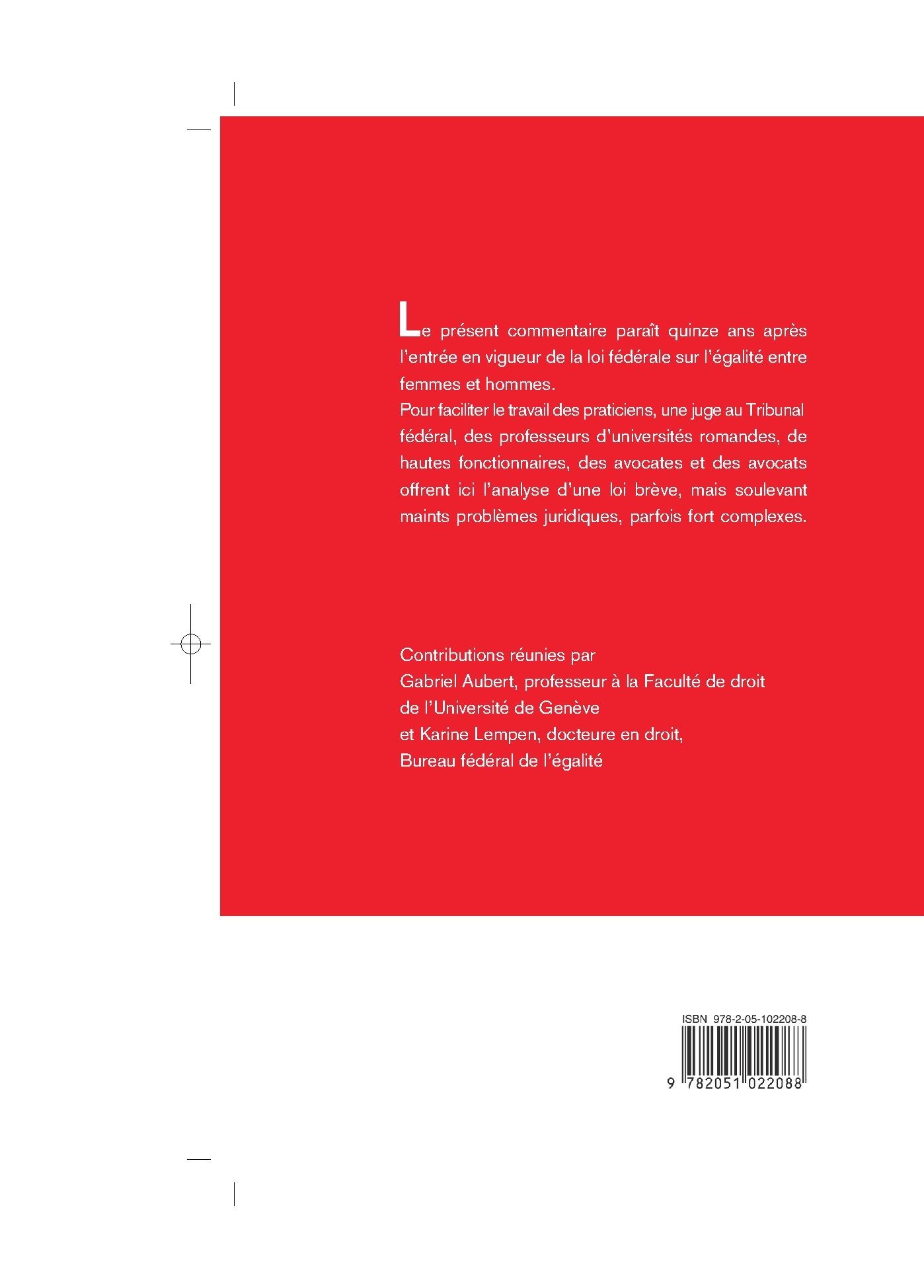 Le présent commentaire paraît quinze ans après l'entrée en vigueur de la loi fédérale sur l'égalité entre femmes et hommes. Pour faciliter le travail des praticiens, une juge au Tribunal fédéral, des professeurs d'universités romandes, de hautes fonctionnaires, des avocates et des avocats offrent ici l'analyse d'une loi brève, mais soulevant maints problèmes juridiques, parfois fort complexes. Contributions réunies par Gabriel Aubert, professeur à la Faculté de droit de l'Université de Genève et Karine Lempen, docteure en droit, Bureau fédéral de l'égalité.