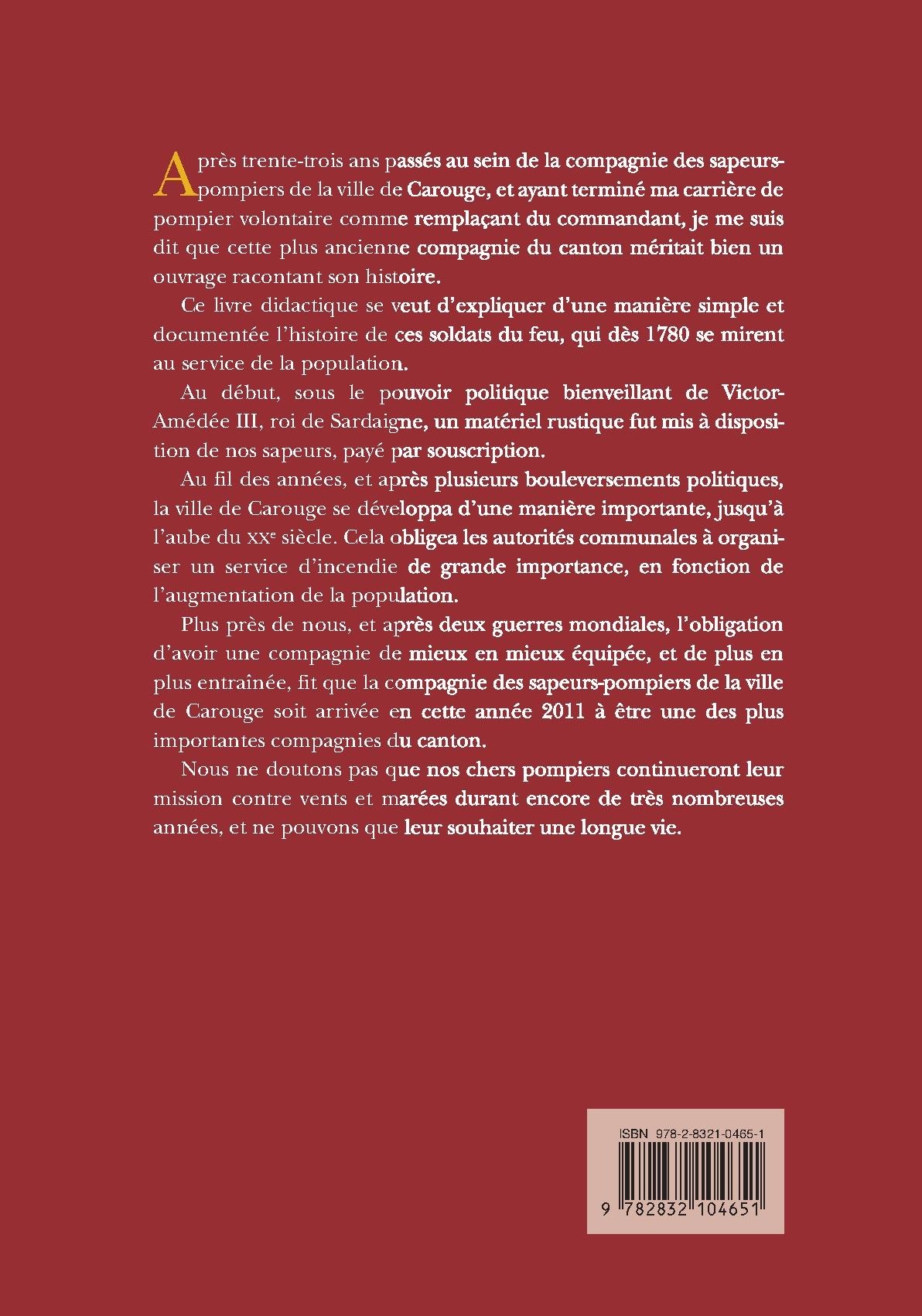 Après trente-trois ans passés au sein de la compagnie des sapeurs-pompiers de la ville de Carouge, et ayant terminé ma carrière de pompier volontaire comme remplaçant du commandant, je me suis dit que cette plus ancienne compagnie du canton méritait bien un ouvrage racontant son histoire. Ce livre didactique se veut d`expliquer d`une manière simple et documentée l`histoire de ces soldats du feu, qui dès 1780 se mirent au service de la population. Au début, sous le pouvoir politique bienveillant de Victor- Amédée III, roi de Sardaigne, un matériel rustique fut mis à disposition de nos sapeurs, payé par souscription. Au fil des années, et après plusieurs bouleversements politiques, la ville de Carouge se développa d`une manière importante, jusqu`à l`aube du XXe siècle. Cela obligea les autorités communales à organiser un service d`incendie de grande importance, en fonction de l`augmentation de la population. Plus près de nous, et après deux guerres mondiales, l`obligation d`avoir une compagnie de mieux en mieux équipée, et de plus en plus entraînée, fit que la compagnie des sapeurs-pompiers de la ville de Carouge soit arrivée en cette année 2011 à être une des plus importantes compagnies du canton. Nous ne doutons pas que nos chers pompiers continueront leur mission contre vents et marées durant encore de très nombreuses années, et ne pouvons que leur souhaiter une longue vie.