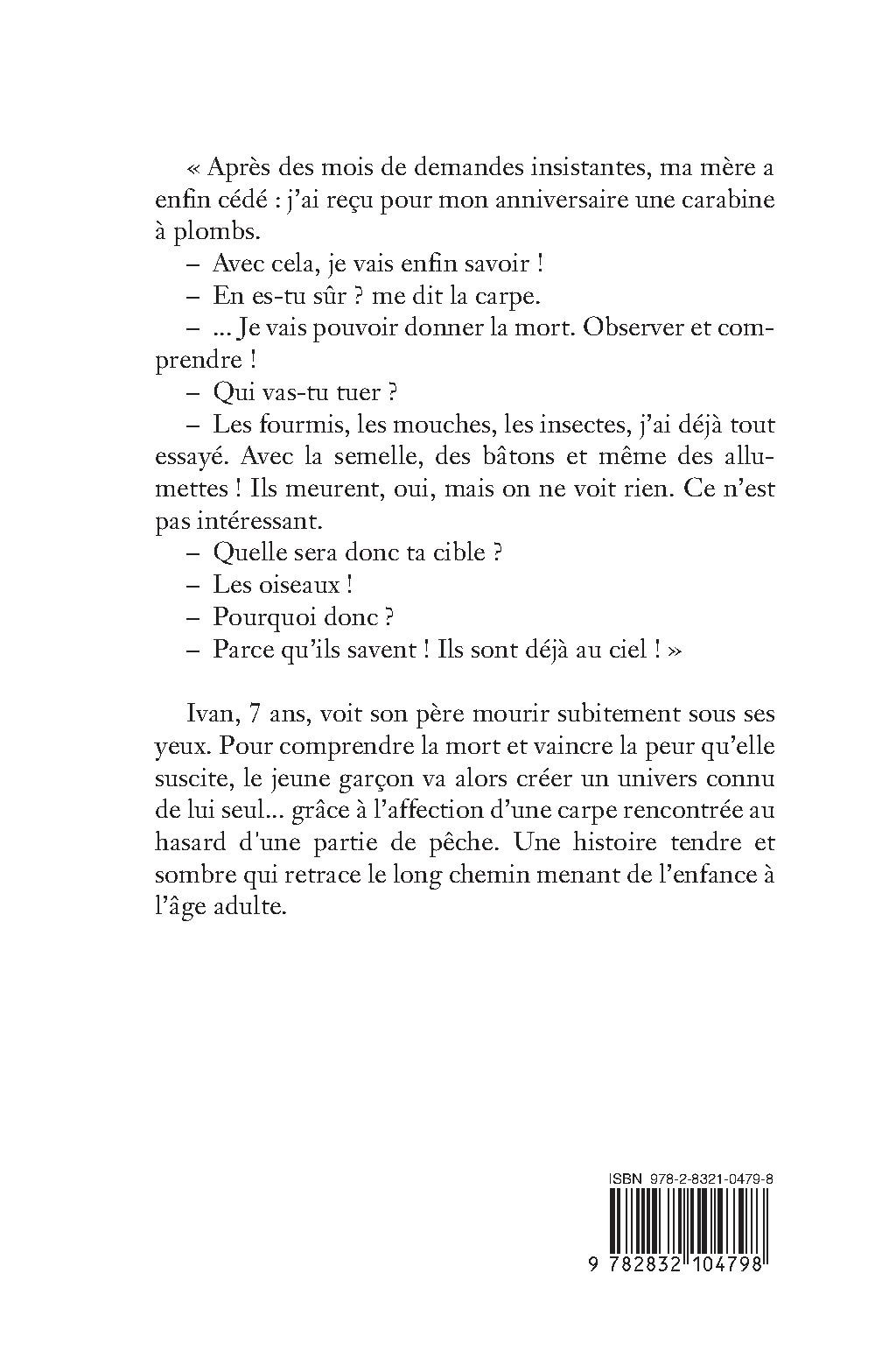 « Après des mois de demandes insistantes, ma mère a enfin cédé: j`ai reçu pour mon anniversaire une carabine à plombs. -Avec cela, je vais enfin savoir ! -En es-tu sûr ? me dit la carpe. -...Je vais pouvoir donner la mort. Observer et comprendre ! -Qui vas-tu tuer ? -Les fourmis, les mouches, les insectes, j`ai déjà tout essayé. Avec la semelle, des bâtons et même des allumettes! Ils meurent, oui, mais on ne voit rien. Ce n`est pas intéressant. -Quelle sera donc ta cible ? -Les oiseaux ! -Pourquoi donc ? -Parce qu’ils savent ! Ils sont déjà au ciel ! »