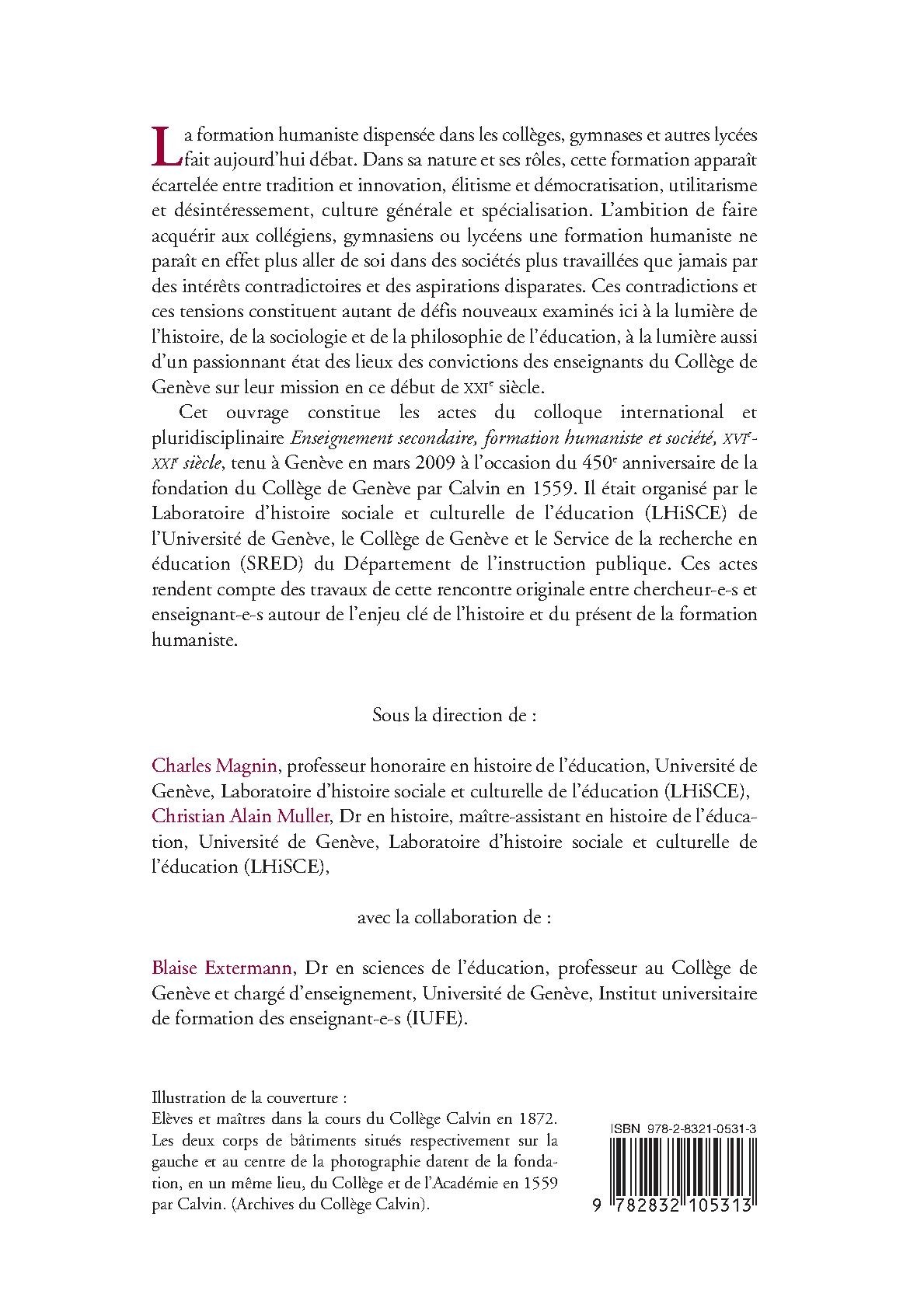 La formation humaniste dispensée dans les collèges, gymnases et autres lycées fait aujourd’hui débat. Dans sa nature et ses rôles, cette formation apparaît écartelée entre tradition et innovation, élitisme et démocratisation, utilitarisme et désintéressement, culture générale et spécialisation. L’ambition de faire acquérir aux collégiens, gymnasiens ou lycéens une formation humaniste ne paraît en effet plus aller de soi dans des sociétés plus travaillées que jamais par des intérêts contradictoires et des aspirations disparates. Ces contradictions et ces tensions constituent autant de défis nouveaux examinés ici à la lumière de l’histoire, de la sociologie et de la philosophie de l’éducation, à la lumière aussi d’un passionnant état des lieux des convictions des enseignants du Collège de Genève sur leur mission en ce début de XXIe siècle. Cet ouvrage constitue les actes du colloque international et pluridisciplinaire Enseignement secondaire, formation humaniste et société, XVIe- XXIe siècle, tenu à Genève en mars 2009 à l’occasion du 450e anniversaire de la fondation du Collège de Genève par Calvin en 1559. Il était organisé par le Laboratoire d’histoire sociale et culturelle de l’éducation (LHiSCE) de l’Université de Genève, le Collège de Genève et le Service de la recherche en éducation (SRED) du Département de l’instruction publique. Ces actes rendent compte des travaux de cette rencontre originale entre chercheur-e-s et enseignant-e-s autour de l’enjeu clé de l’histoire et du présent de la formation humaniste.