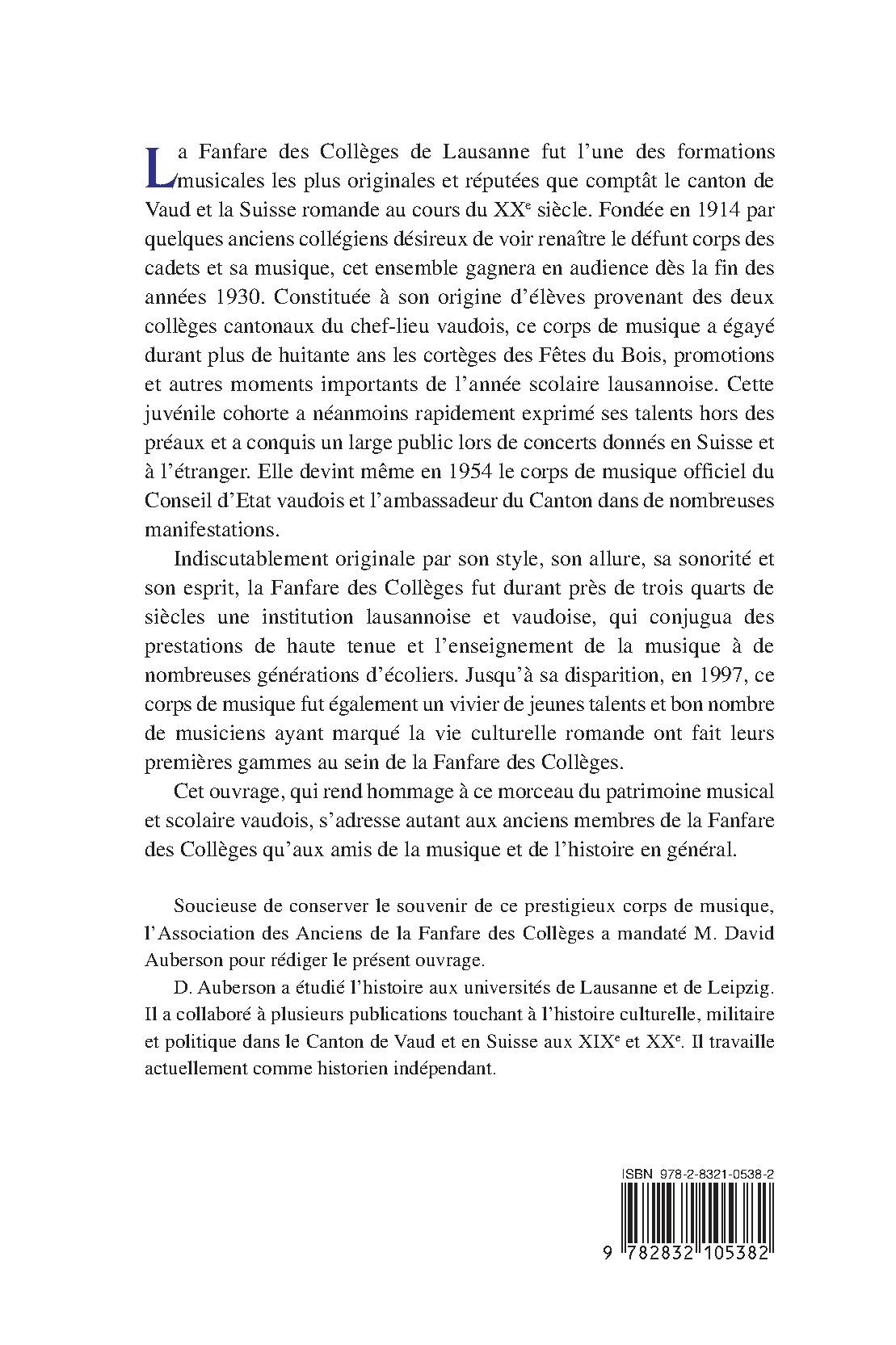 La Fanfare des Collèges de Lausanne fut l’une des formations musicales les plus originales et réputées que comptât le canton de Vaud et la Suisse romande au cours du XXe siècle. Fondée en 1914 par quelques anciens collégiens désireux de voir renaître le défunt corps des cadets et sa musique, cet ensemble gagnera en audience dès la fin des années 1930. Constituée à son origine d’élèves provenant des deux collèges cantonaux du chef-lieu vaudois, ce corps de musique a égayé durant plus de huitante ans les cortèges des Fêtes du Bois, promotions et autres moments importants de l’année scolaire lausannoise. Cette juvénile cohorte a néanmoins rapidement exprimé ses talents hors des préaux et a conquis un large public lors de concerts donnés en Suisse et à l’étranger. Elle devint même en 1954 le corps de musique officiel du Conseil d’Etat vaudois et l’ambassadeur du Canton dans de nombreuses manifestations. Indiscutablement originale par son style, son allure, sa sonorité et son esprit, la Fanfare des Collèges fut durant près de trois quarts de siècles une institution lausannoise et vaudoise, qui conjugua des prestations de haute tenue et l’enseignement de la musique à de nombreuses générations d’écoliers. Jusqu’à sa disparition, en 1997, ce corps de musique fut également un vivier de jeunes talents et bon nombre de musiciens ayant marqué la vie culturelle romande ont fait leurs premières gammes au sein de la Fanfare des Collèges. Cet ouvrage, qui rend hommage à ce morceau du patrimoine musical et scolaire vaudois, s’adresse autant aux anciens membres de la Fanfare des Collèges qu’aux amis de la musique et de l’histoire en général.
