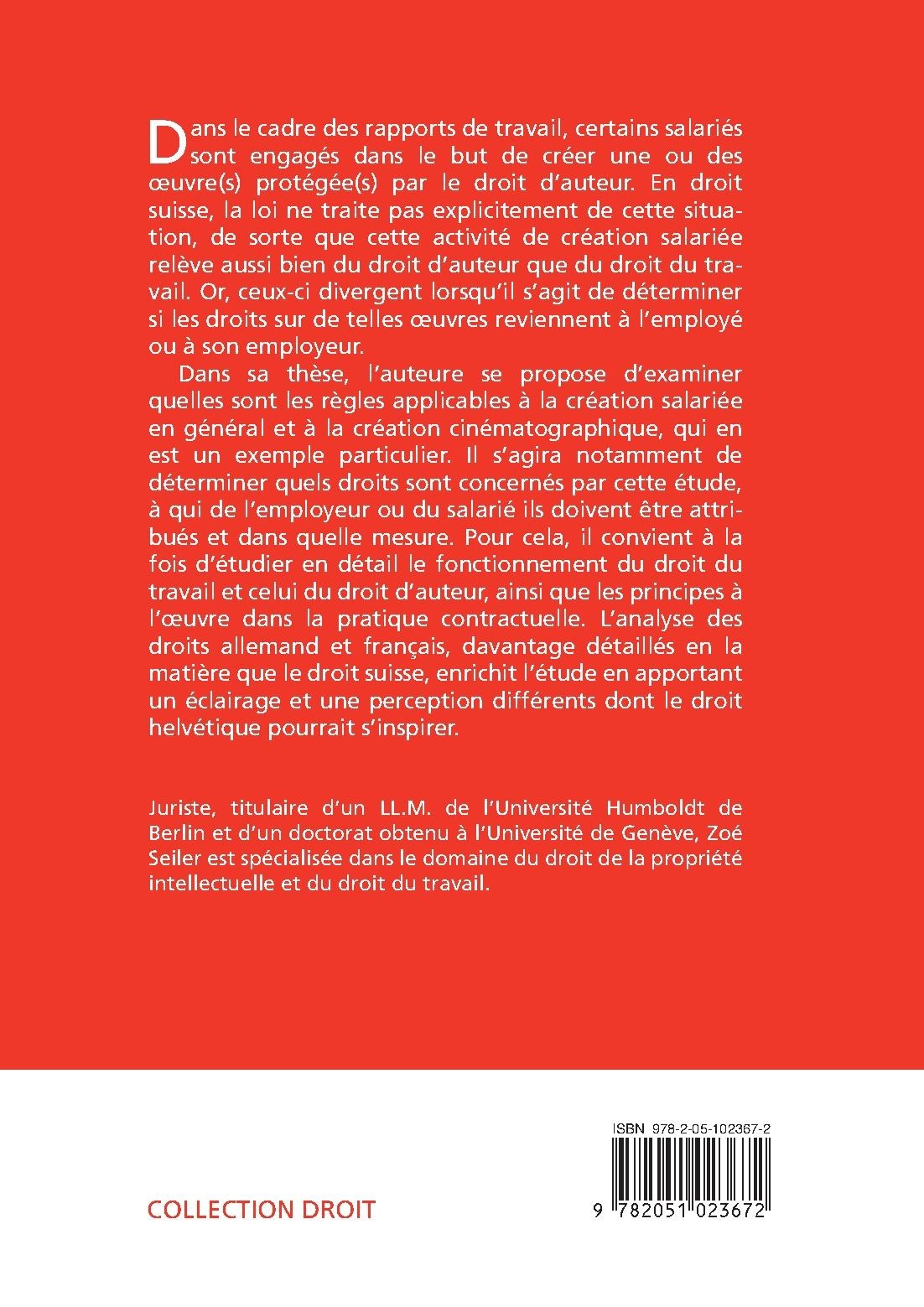 Dans le cadre des rapports de travail, certains salariés sont engagés dans le but de créer une ou des œuvre(s) protégée(s) par le droit d’auteur. En droit suisse, la loi ne traite pas explicitement de cette situation, de sorte que cette activité de création salariée relève aussi bien du droit d’auteur que du droit du travail. Or, ceux-ci divergent lorsqu’il s’agit de déterminer si les droits sur de telles œuvres reviennent à l’employé ou à son employeur. Dans sa thèse, l’auteure se propose d’examiner quelles sont les règles applicables à la création salariée en général et à la création cinématographique, qui en est un exemple particulier. Il s’agira notamment de déterminer quels droits sont concernés par cette étude, à qui de l’employeur ou du salarié ils doivent être attribués et dans quelle mesure. Pour cela, il convient à la fois d’étudier en détail le fonctionnement du droit du travail et celui du droit d’auteur, ainsi que les principes à l’œuvre dans la pratique contractuelle. L’analyse des droits allemand et français, davantage détaillés en la matière que le droit suisse, enrichit l’étude en apportant un éclairage et une perception différents dont le droit helvétique pourrait s’inspirer. Juriste, titulaire d’un LL.M. de l’Université Humboldt de Berlin et d’un doctorat obtenu à l’Université de Genève, Zoé Seiler est spécialisée dans le domaine du droit de la propriété intellectuelle et du droit du travail.