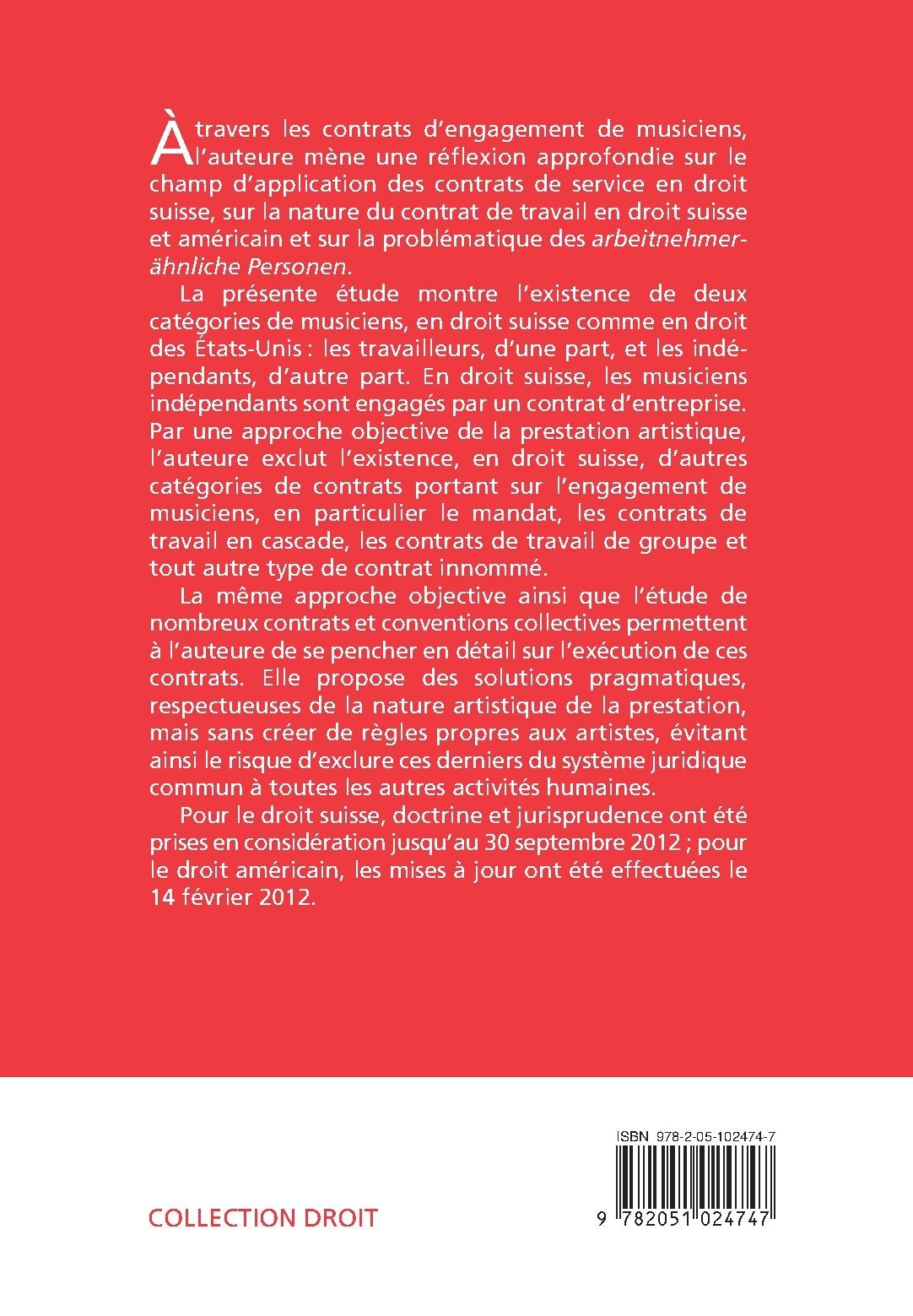 À travers les contrats d’engagement de musiciens, l’auteure mène une réflexion approfondie sur le champ d’application des contrats de service en droit suisse, sur la nature du contrat de travail en droit suisse et américain et sur la problématique des « arbeit nehmer - ähnliche Personen ». La présente étude montre l’existence de deux catégories de musiciens, en droit suisse comme en droit des États- Unis : les travailleurs, d’une part, et les indépendants, d’autre part. En droit suisse, les musiciens indépendants sont engagés par un contrat d’entreprise. Par une approche objective de la prestation artistique, l’auteure exclut l’existence, en droit suisse, d’autres catégories de contrats portant sur l’engagement de musiciens, en particulier le mandat, les contrats de travail en cascade, les contrats de travail de groupe et tout autre type de contrat innommé. La même approche objective ainsi que l’étude de nombreux contrats et conventions collectives permettent à l’auteure de se pencher en détail sur l’exécution de ces contrats. Elle propose des solutions pragmatiques, respectueuses de la nature artistique de la prestation, mais sans créer de règles propres aux artistes, évitant ainsi le risque d’exclure ces derniers du système juridique commun à toutes les autres activités humaines. Pour le droit suisse, doctrine et jurisprudence ont été prises en considération jusqu’au 30 septembre 2012 ; pour le droit américain, les mises à jour ont été effectuées le 14 février 2012.