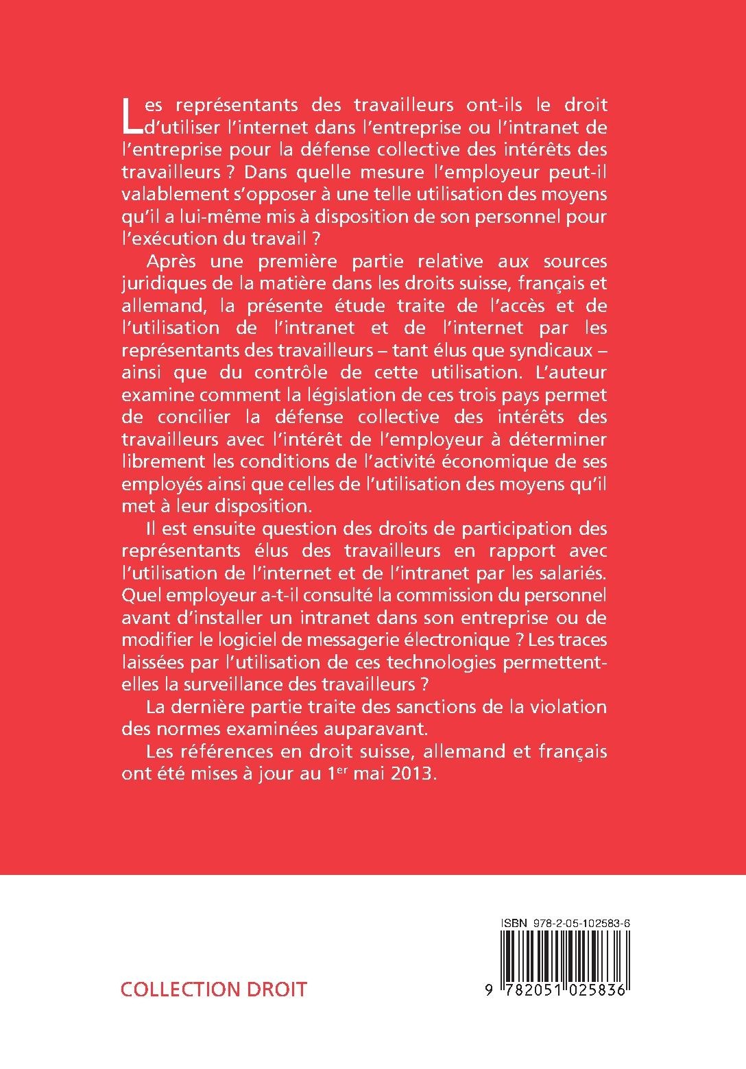 Après une première partie relative aux sources juridiques de la matière dans les droits suisse, français et allemand, la présente étude traite de l’accès et de l’utilisation de l’intranet et de l’internet par les représentants des travailleurs – tant élus que syndicaux – ainsi que du contrôle de cette utilisation. L’auteur examine comment la législation de ces trois pays permet de concilier la défense collective des intérêts des travailleurs avec l’intérêt de l’employeur à déterminer librement les conditions de l’activité économique de ses employés ainsi que celles de l’utilisation des moyens qu’il met à leur disposition.