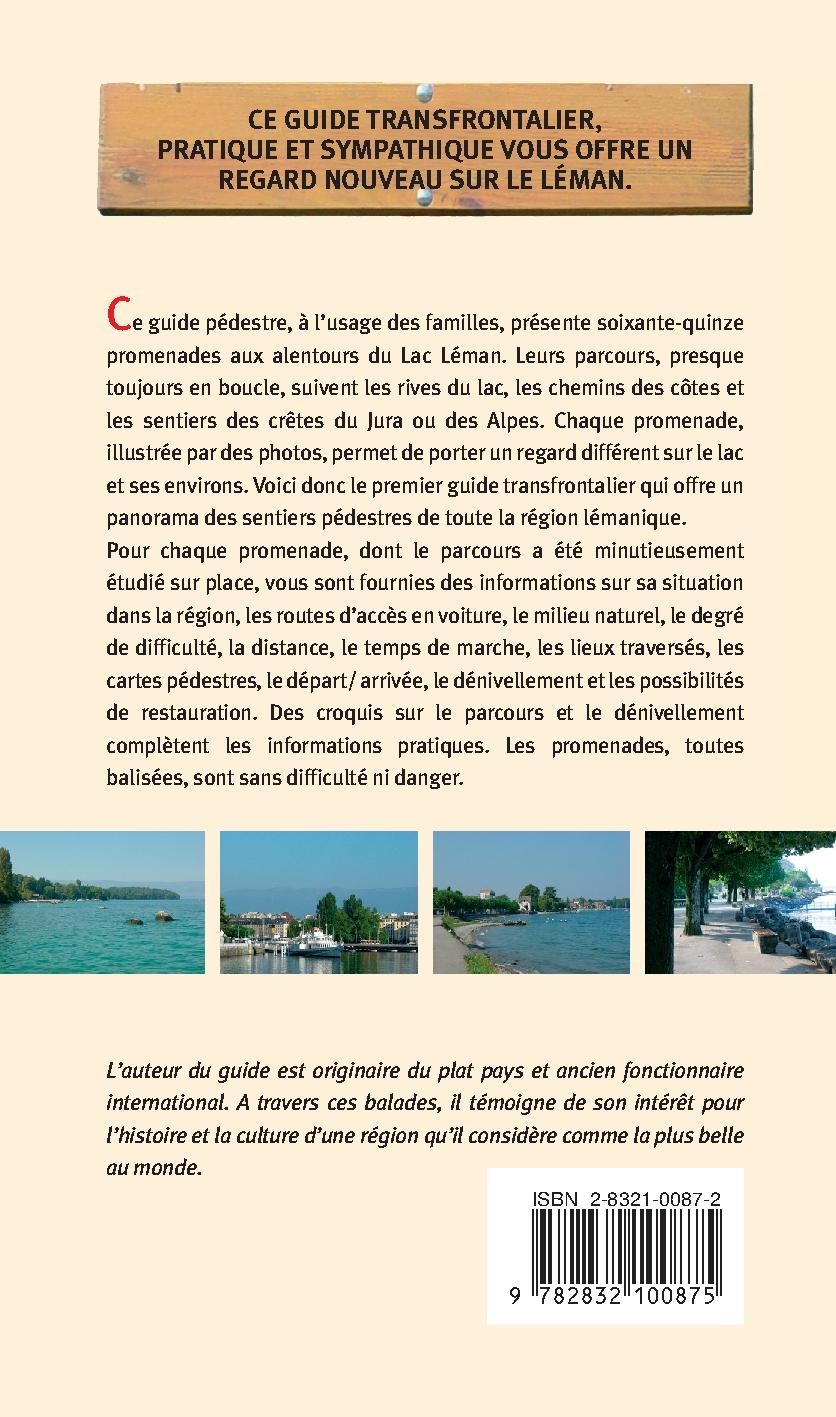 Ce guide pédestre, à l'usage des familles, présente soixante-quinze promenades aux alentours du Lac Léman. Leurs parcours, presque toujours en boucle, suivent les rives du lac, les chemins des côtes et les sentiers des crêtes du Jura ou des Alpes. Chaque promenade, illustrée par des photos, permet de porter un regard différent sur le lac et ses environs. Voici donc le premier guide transfrontalier qui offre un panorama des sentiers pédestres de toute la région lémanique. Pour chaque promenade, dont le parcours a été minutieusement étudié sur place, vous sont fournies des informations sur sa situation dans la région, les routes d'accès en voiture, le milieu naturel, le degré de difficulté, la distance, le temps de marche, les lieux traversés, les cartes pédestres, le départ/ arrivée, le dénivellement et les possibilités de restauration. Des croquis sur le parcours et le dénivellement complètent les informations pratiques. Les promenades, toutes balisées, sont sans difficulté ni danger.