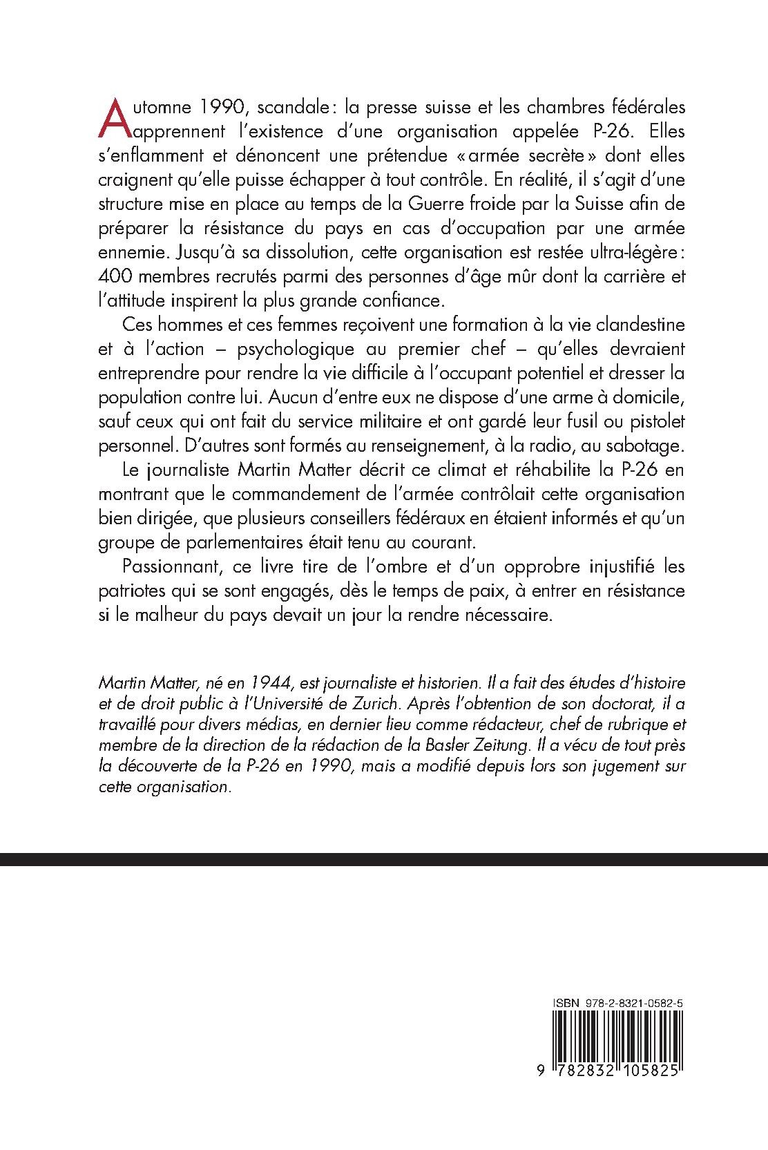 Automne 1990, scandale: la presse suisse et les chambres fédérales apprennent l’existence d’une organisation appelée P-26. Elles s’enflamment et dénoncent une prétendue «armée secrète» dont elles craignent qu’elle puisse échapper à tout contrôle. En réalité, il s’agit d’une structure mise en place au temps de la Guerre froide par la Suisse afin de préparer la résistance du pays en cas d’occupation par une armée ennemie. Jusqu’à sa dissolution, cette organisation est restée ultralégère: 400 membres recrutés parmi des personnes d’âge mûr dont la carrière et l’attitude inspirent la plus grande confiance. Ces hommes et ces femmes reçoivent une formation à la vie clandestine et à l’action – psychologique au premier chef – qu’elles devraient entreprendre pour rendre la vie difficile à l’occupant potentiel et dresser la population contre lui. Aucun d’entre eux ne dispose d’une arme à domicile, sauf ceux qui ont fait du service militaire et ont gardé leur fusil ou pistolet personnel. D’autres sont formés au renseignement, à la radio, au sabotage. Le journaliste Martin Matter décrit ce climat et réhabilite la P-26 en montrant que le commandement de l’armée contrôlait cette organisation bien dirigée, que plusieurs conseillers fédéraux en étaient informés et qu’un groupe de parlementaires étaient tenus au courant. Passionnant, ce livre tire de l’ombre et d’un opprobre injustifié les patriotes qui se sont engagés, dès le temps de paix, à entrer en résistance si le malheur du pays devait un jour la rendre nécessaire.