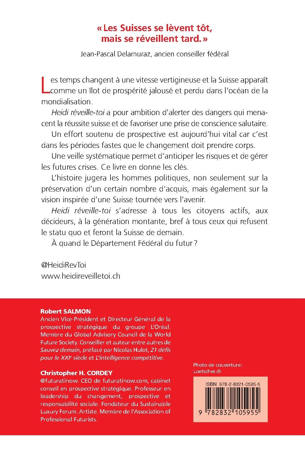 Les temps changent à une vitesse vertigineuse et la Suisse apparaît comme un îlot de prospérité jalousé et perdu dans l’océan de la mondialisation. Heidi réveille-toi a pour ambition d’alerter des dangers qui menacent la réussite suisse et de favoriser une prise de conscience salutaire. Un effort soutenu de prospective est aujourd’hui vital car c’est dans les périodes fastes que le changement doit prendre corps. Une veille systématique permet d’anticiper les risques et de gérer les futures crises. Ce livre en donne les clés. L’histoire jugera les hommes politiques, non seulement sur la préservation d’un certain nombre d’acquis, mais également sur la vision inspirée d’une Suisse tournée vers l’avenir. Heidi réveille-toi s’adresse à tous les citoyens actifs, aux décideurs, à la génération montante, bref à tous ceux qui refusent le statu quo et feront la Suisse de demain.