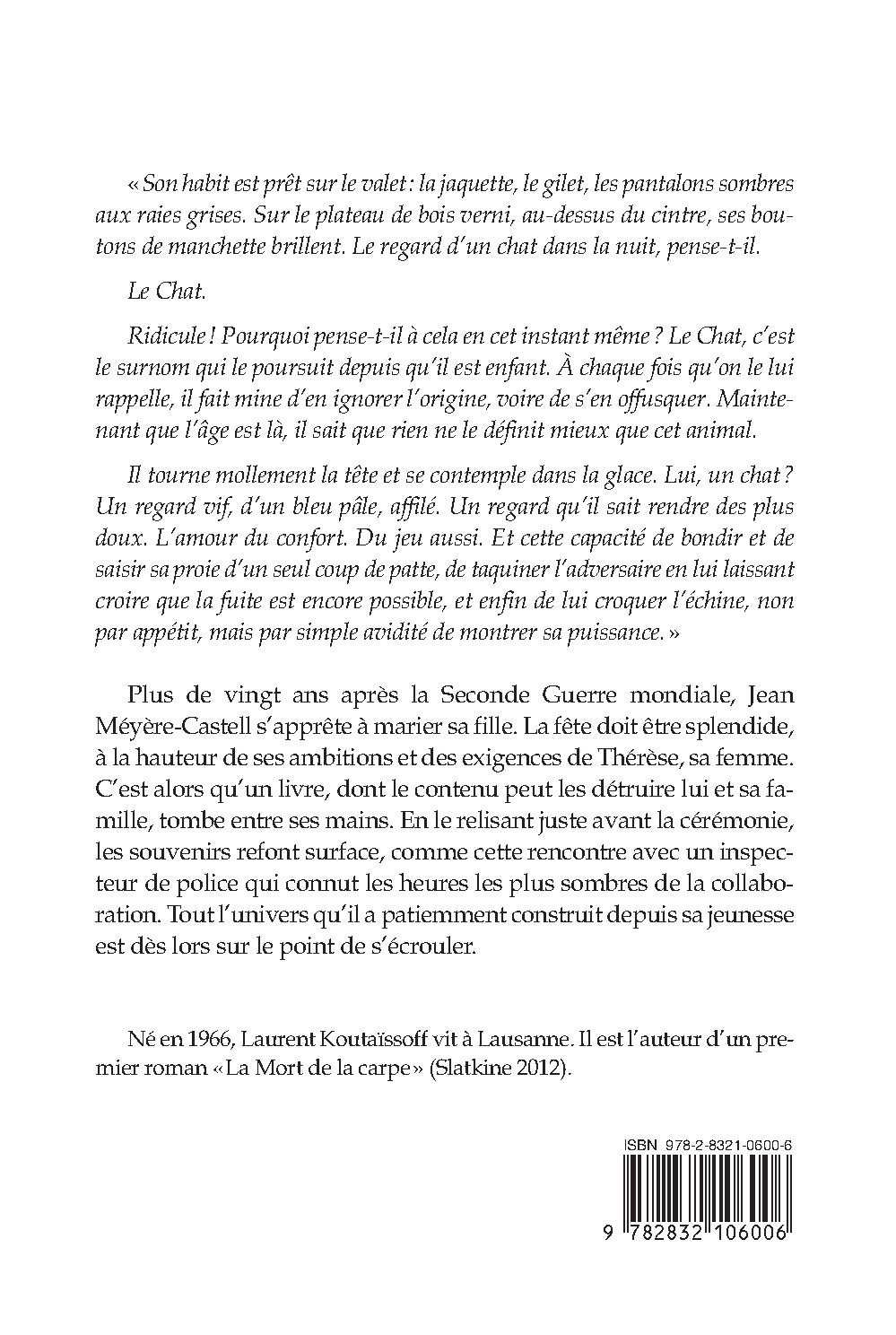 Ridicule! Pourquoi pense-t-il à cela en cet instant même? Le Chat, c’est le surnom qui le poursuit depuis qu’il est enfant. À chaque fois qu’on le lui rappelle, il fait mine d’en ignorer l’origine, voire de s’en offusquer. Maintenant que l’âge est là, il sait que rien ne le définit mieux que cet animal. Il tourne mollement la tête et se contemple dans la glace. Lui, un chat?