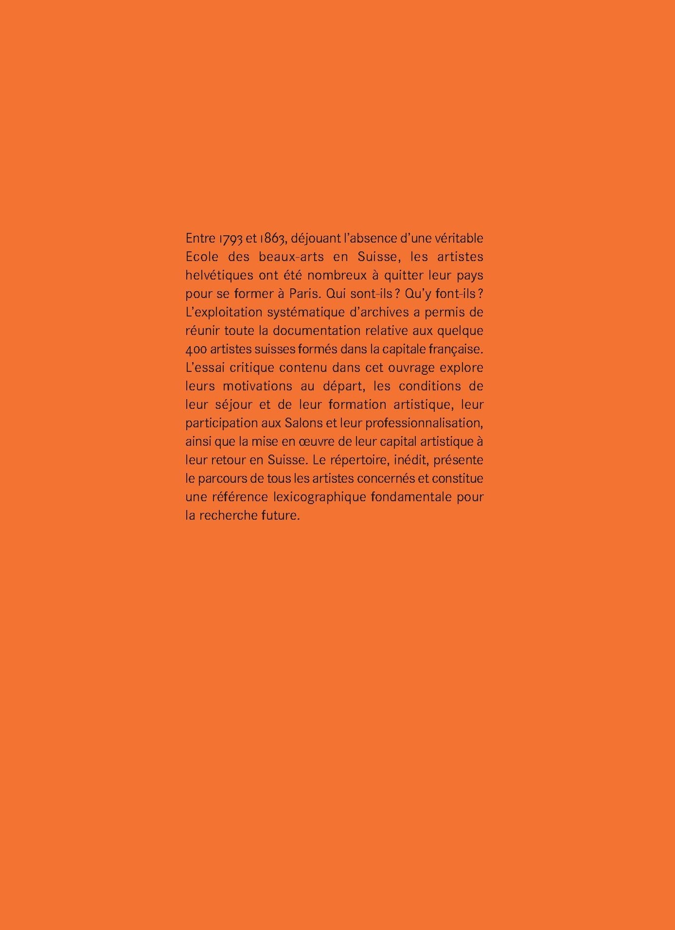 Entre 1793 et 1863, déjouant l’absence d’une véritable Ecole des beaux-arts en Suisse, les artistes helvétiques ont été nombreux à quitter leur pays pour se former à Paris. Qui sont-ils ? Qu’y font-ils ? L’exploitation systématique d’archives a permis de réunir toute la documentation relative aux quelque 400 artistes suisses formés dans la capitale française. L’essai critique contenu dans cet ouvrage explore leurs motivations au départ, les conditions de leur séjour et de leur formation artistique, leur participation aux Salons et leur professionnalisation, ainsi que la mise en œuvre de leur capital artistique à leur retour en Suisse. Le répertoire, inédit, présente le parcours de tous les artistes concernés et constitue une référence lexicographique fondamentale pour la recherche future.