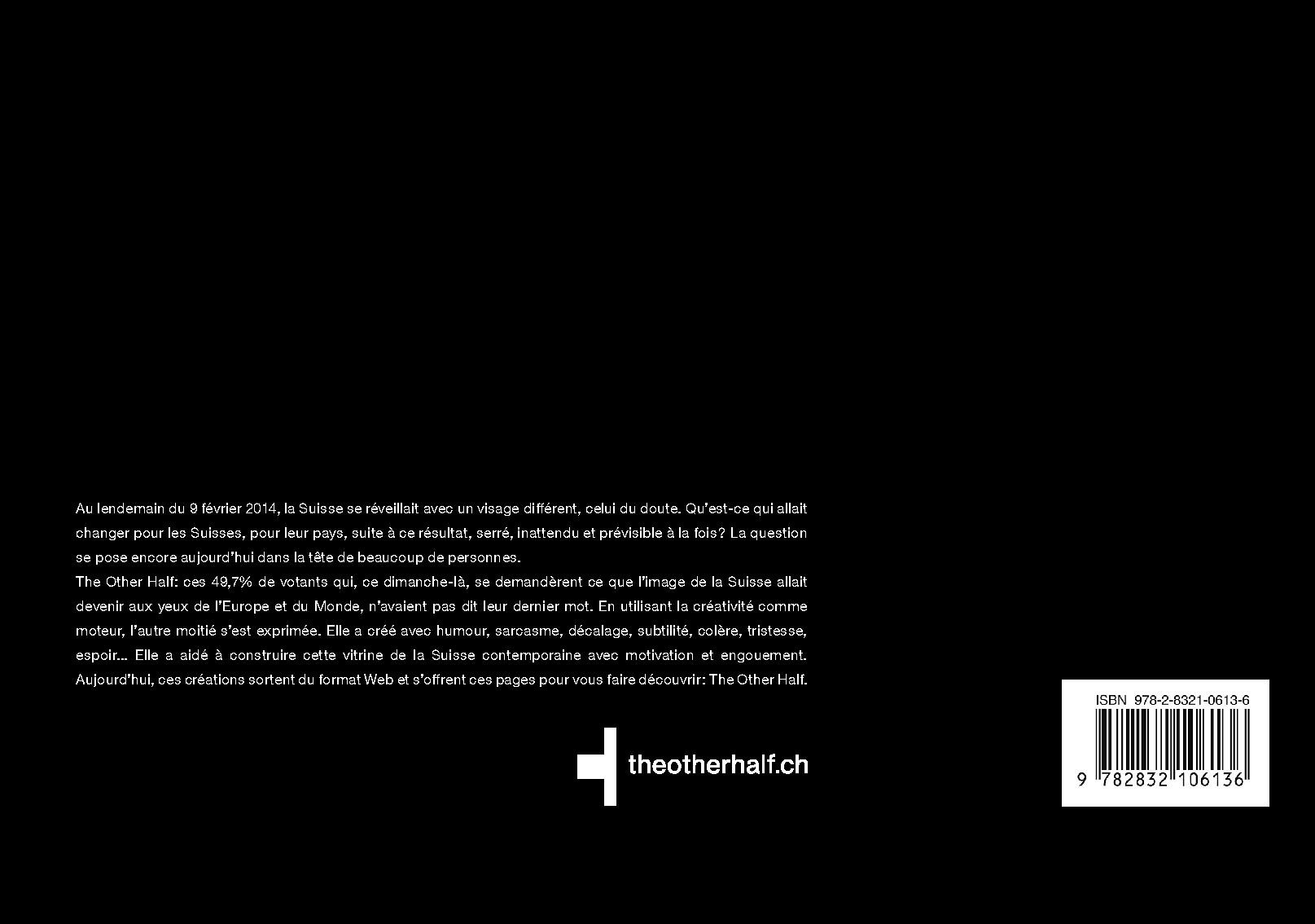 Au lendemain du 9 février 2014, la Suisse se réveillait avec un visage différent, celui du doute. Qu’est-ce qui allait changer pour les Suisses, pour leur pays, suite à ce résultat, serré, inattendu et prévisible à la fois? La question se pose encore aujourd’hui dans la tête de beaucoup de personnes. The Other Half: ces 49,7% de votants qui, ce dimanche-là, se demandèrent ce que l’image de la Suisse allait devenir aux yeux de l’Europe et du Monde, n’avaient pas dit leur dernier mot. En utilisant la créativité comme moteur, l’autre moitié s’est exprimée. Elle a créé avec humour, sarcasme, décalage, subtilité, colère, tristesse, espoir... Elle a aidé à construire cette vitrine de la Suisse contemporaine avec motivation et engouement. Aujourd’hui, ces créations sortent du format Web et s’offrent ces pages pour vous faire découvrir: The Other Half.
